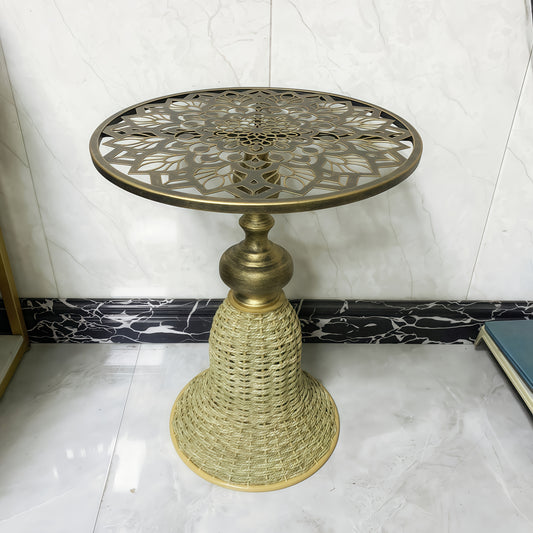 Handcrafted Rattan & Vintage Bronze Metal Round Side Table