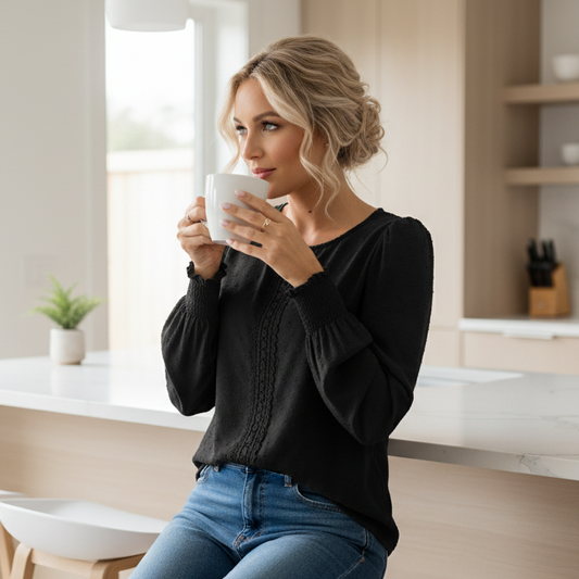 PRIVÉ Notched Neckline Shirred Sleeve Polyester Blouse