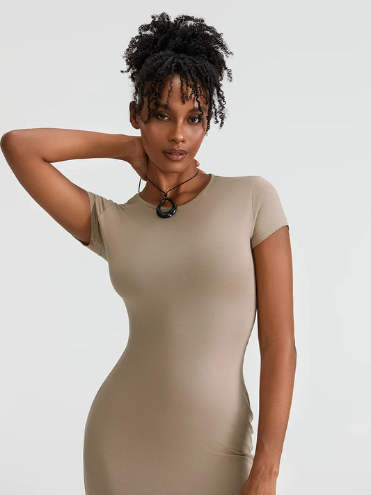 Short Sleeve Crew Neck Midi Bodycon Slip Dress