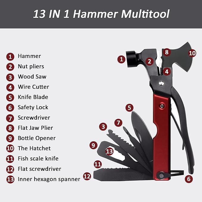 Crafted with high-quality stainless steel, our hatchet features a sharp blade for cutting branches, chopping firewood, and more. The 15 additional tools, including a hammer, pliers, saw, screwdrivers, and more, provide everything you need for repairs, cooking, and survival in the wilderness.