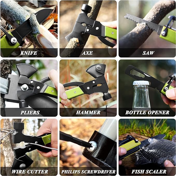 From setting up camp to handling emergencies, our 16 in 1 Hatchet with Multitool Camping Accessories is your go-to tool for outdoor adventures. Whether you're camping, hiking, fishing, or hunting, this multifunctional tool is designed to make your outdoor experience more convenient and enjoyable.