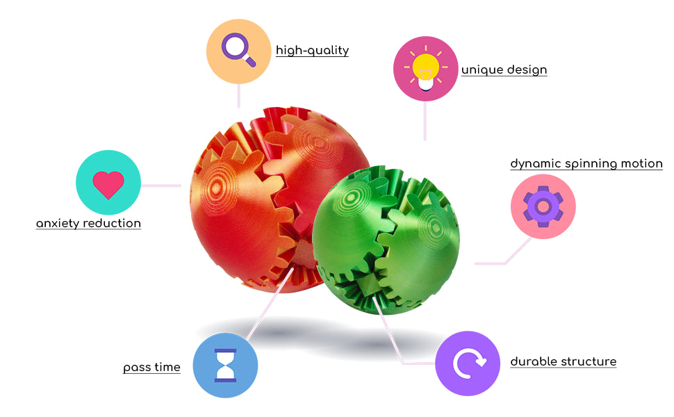 This fidget spin gear ball is an innovative finger toy designed to provide stress relief and anxiety reduction effects. It is made of high-quality 3D printed materials with a smooth surface and durable structure.