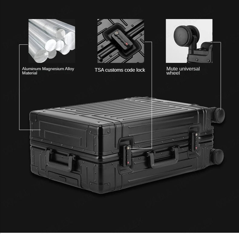 Aviation Grade Aluminum Travel Suitcases Crafted with precision and durability in mind, these travel suitcases are made from aviation grade aluminum, a lightweight and sturdy material that offers superior protection for your belongings during your travels.