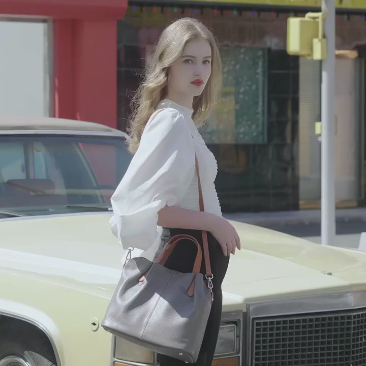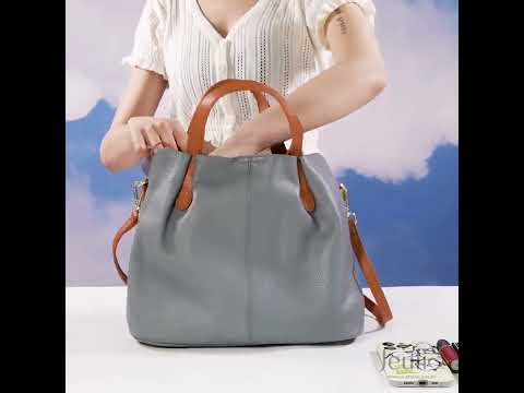 Premium leather craftsmanship showcases two handles and a removable adjustable shoulder strap in contrasting colors. Enjoy plenty of room for your essentials, with the option of styling as a shoulder or cross-body bag. Main zip closure and side magnets.