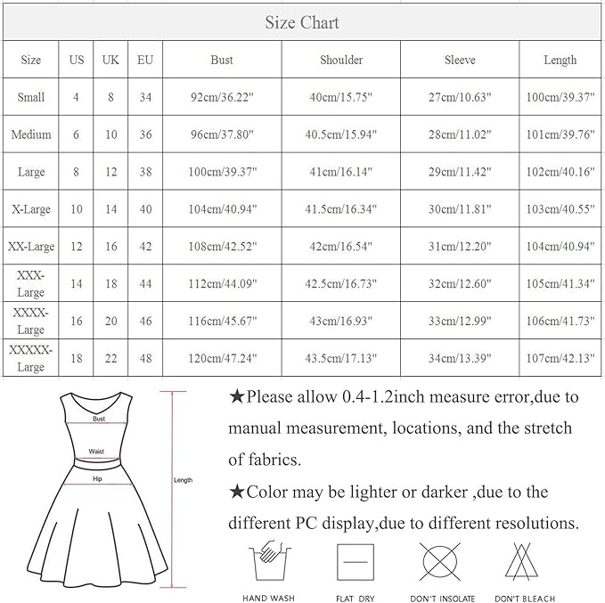 Size: 4XL – US: 16 – UK: 20 – EU: 46 – Bust: 116 cm/45.67 inches; Waist: 126 cm/49.61 inches; Hip: 136 cm/53.54 inches; Shoulder: 43 cm/16.93 inches; Sleeve: 33 cm/12.99 inches; Length: 106 cm/41.73 inches.