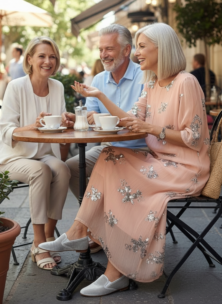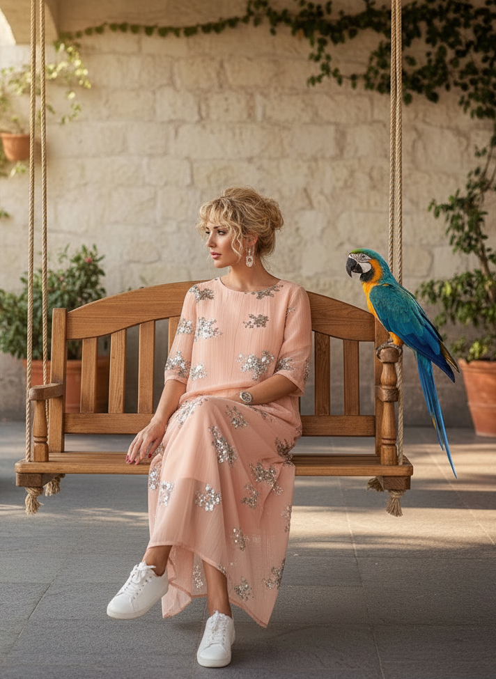 Effortless charm with this blush pink maxi dress adorned with sparkling silver sequins. Its short sleeves and timeless round neckline complement the flowing A-line skirt, creating a graceful look ideal for relaxed, stylish days.
