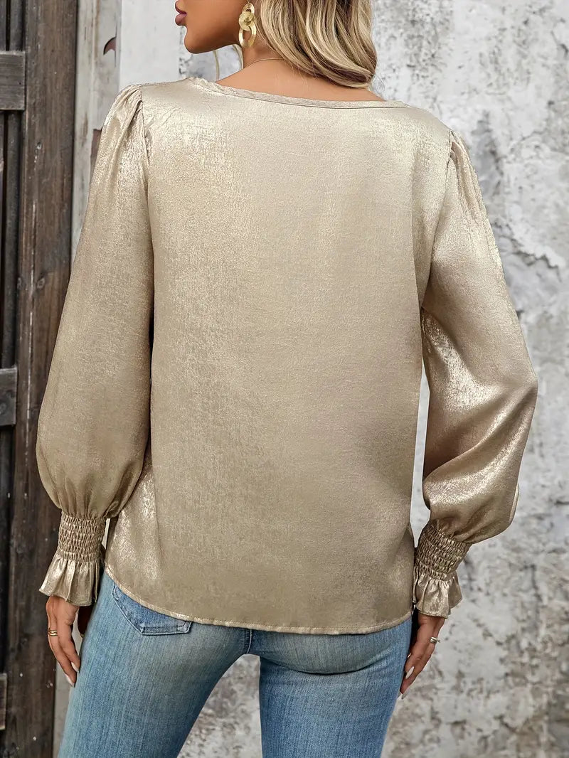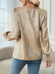 Add a touch of glamour to your wardrobe with this champagne gold top, featuring a classic round neckline and flowing bell sleeves that create a graceful silhouette. Its lustrous fabric shines subtly, perfect for both daytime events and evening gatherings. This versatile piece pairs effortlessly with denim for a casual look or with tailored bottoms for a polished ensemble. Comfortable and stylish, it’s designed to make you feel confident and radiant no matter the occasion. Elevate your everyday style with this elegant, must-have top.
