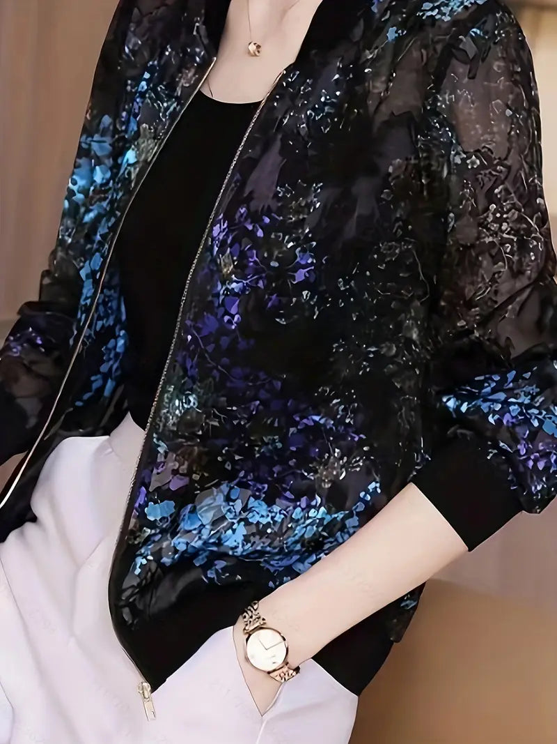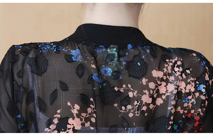 Featuring a loose fit design, long sleeves, and a chic cropped length, this sheer bomber jacket is not only practical but also versatile enough to pair with different outfits. Whether you choose to wear it over a sundress or with your favorite denim, you will feel confident and stylish.