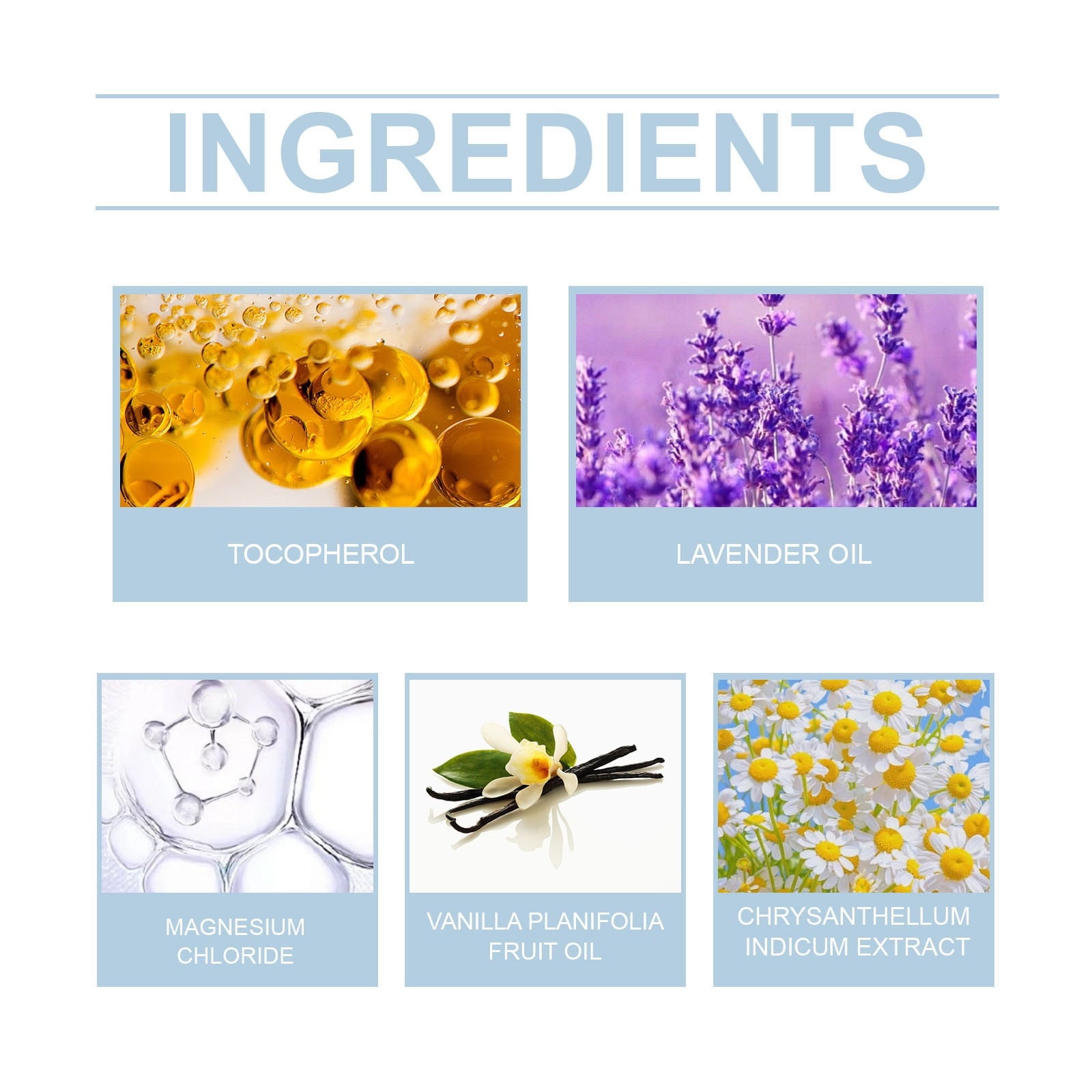 - Ingredients: Tocopherol, Lavender Oil, Magnesium Chloride, Vanilla Planifolia Fruit Oil and Chrysanthellum Indicum Extract.