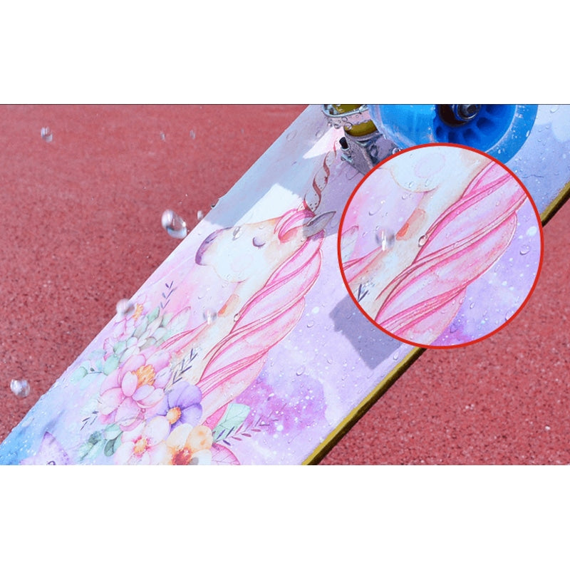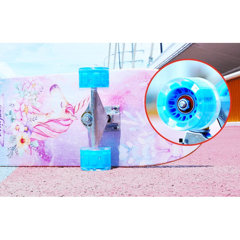 The Kingbox skateboard features big flash wheels that not only enhance your ride but also make it visually stunning, especially at night! With a variety of vibrant colors and patterns to choose from, including Barbie Princess, Unicorn, and Transformers, there is a design to match every personality.