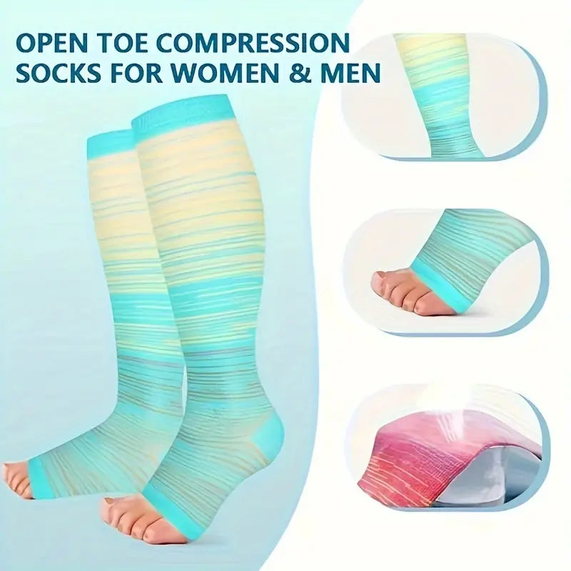 Boost your circulation with this set of 3 pairs of open toe knee-high compression socks, suitable for both women and men. These stockings offer reliable support to help you stay comfortable and active all day long.