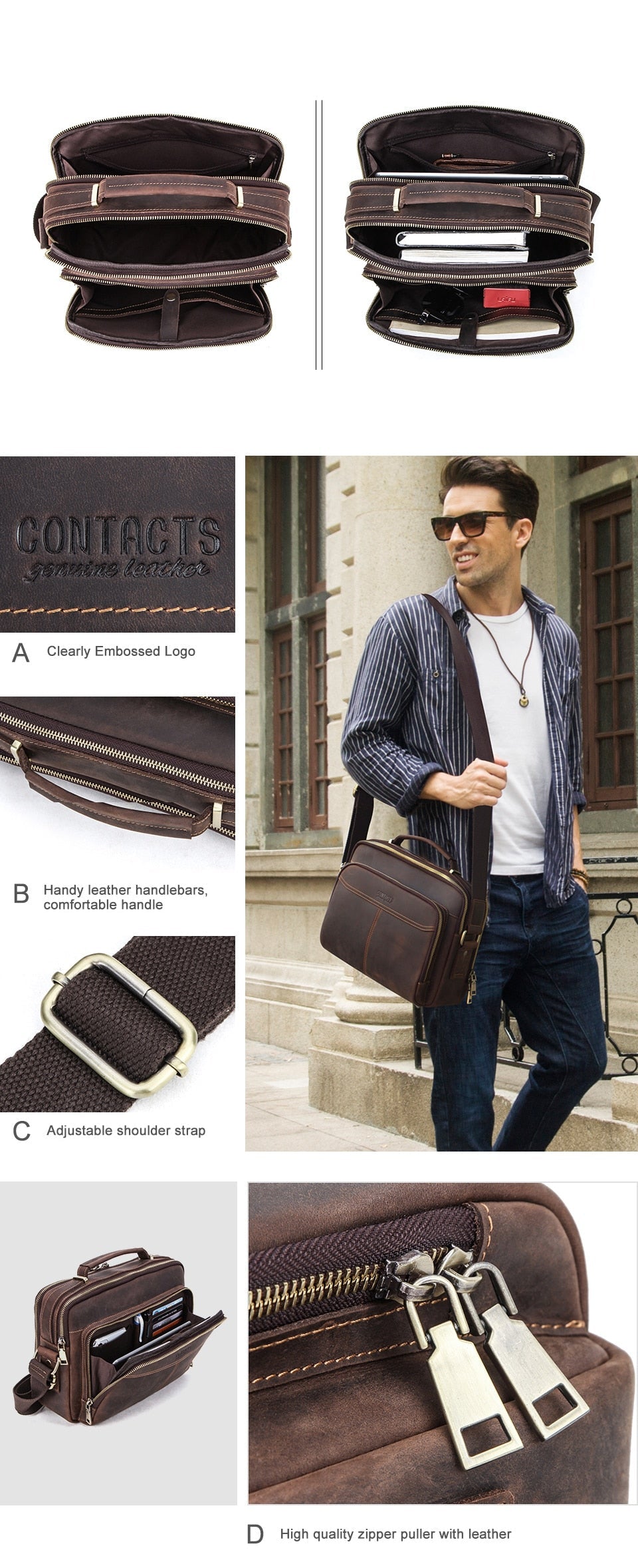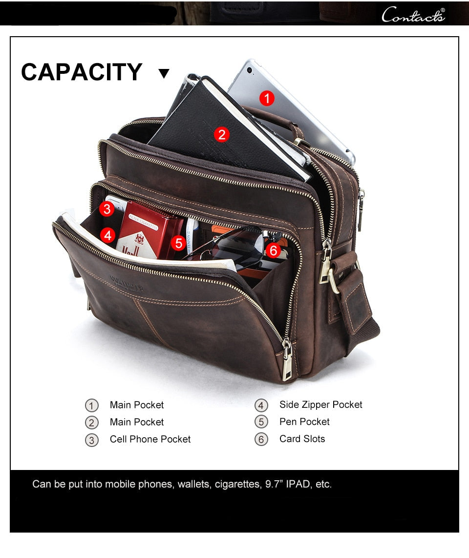 Discover the ultimate blend of style and functionality with our CONTACTS Multifunctional Crazy Horse Leather Bag. Crafted from premium wild horse cowhide, this bag not only boasts a sophisticated look but also promises durability that lasts.