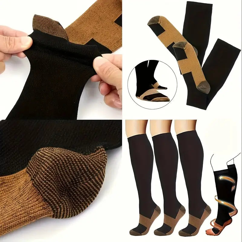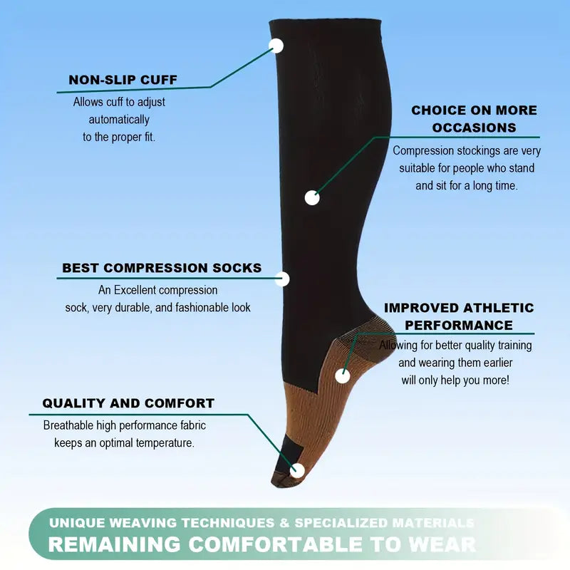 Experience lasting comfort and support with Copper Compression Knee High Socks. Designed to improve circulation and reduce swelling, these socks provide gentle compression that helps relieve tired, achy legs. The copper-infused fabric offers natural antimicrobial benefits, keeping your feet fresh throughout the day. Perfect for active lifestyles or long hours on your feet, these socks combine durability with breathable comfort to keep you moving with ease. Elevate your daily wear with the added support and wellness benefits of Copper Compression Knee High Socks.