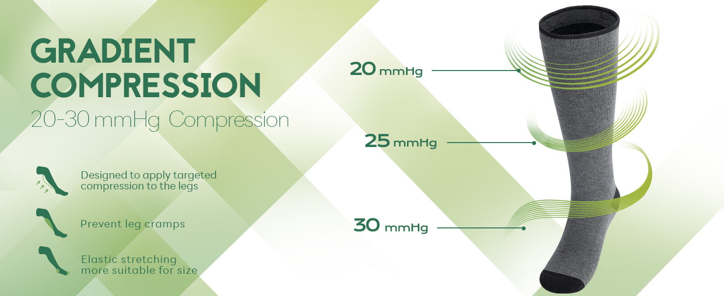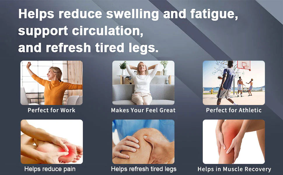Advanced graduated 20-30 mmHg compression may help reduce swelling and fatigue, support healthy circulation, refresh tired legs and feet, and may ease everyday discomfort.
