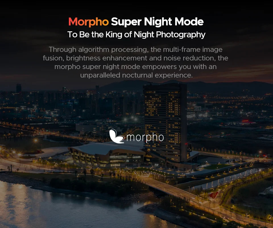 Through algorithm processing, the multi-frame image fusion, brightness enhancement and noise reduction, the morpho super night mode empowers you with an unparalleled nocturnal experience.