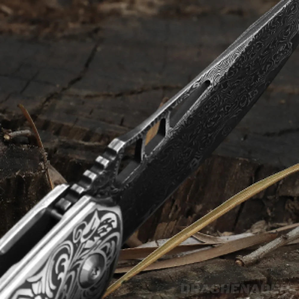 DRACHENADER VG 10 Damascus Shark Dragon Pocket Knife - Discover the ultimate companion for your outdoor adventures. Crafted from premium Damascus steel, this knife is not only visually stunning but also built to last. The blade length of 8.6 cm and tip angle of 60+ degrees make it a versatile tool for various tasks, whether you're camping, hiking, or simply need a reliable knife for everyday carry.