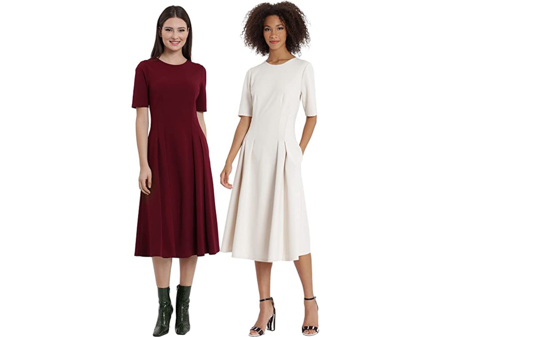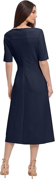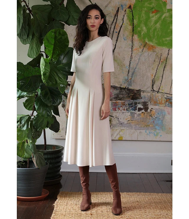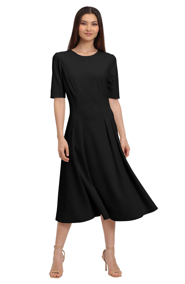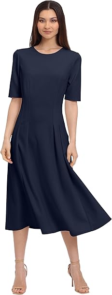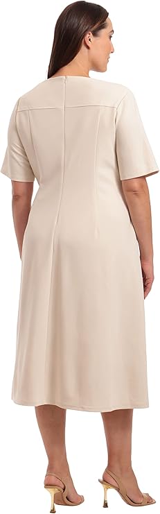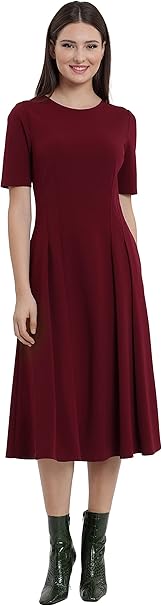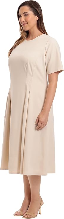 From Maggy London, this dress features: scuba crepe fabrication A-line silhouette crew neckline short sleeves seamed bodice double pleats midi length partially lined center back zip closure approx. 44.5" from shoulder to hem polyester/spandex hand wash cold separately, reshape, lay flat to dry; do not bleach, warm iron as needed Imported.