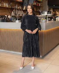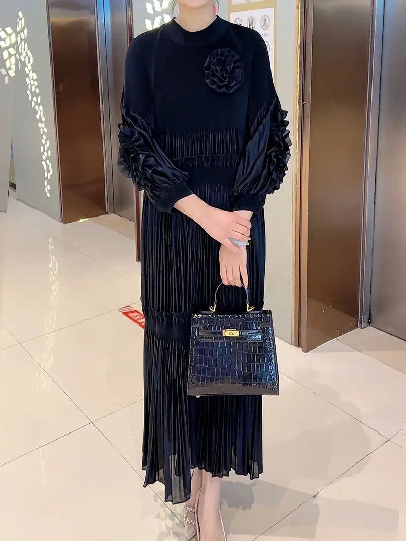 Enjoy a playful twist on elegance with this long fine pleated dress featuring stunning floral applique features. Made from stretchy polyester, it offers a comfortable round neck and an airy A-line shape with charming ruffles. Ideal for all seasons, its solid colors and lightweight lining make it perfect for casual outings. Simple pullover design, this dress blends style and ease effortlessly.
