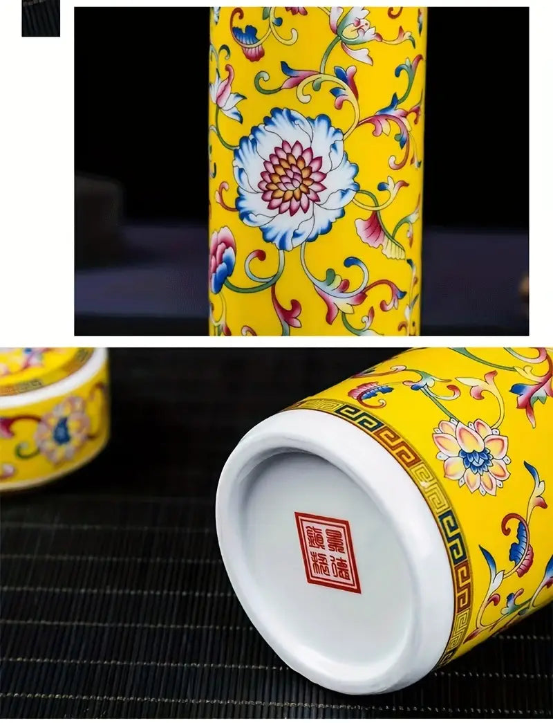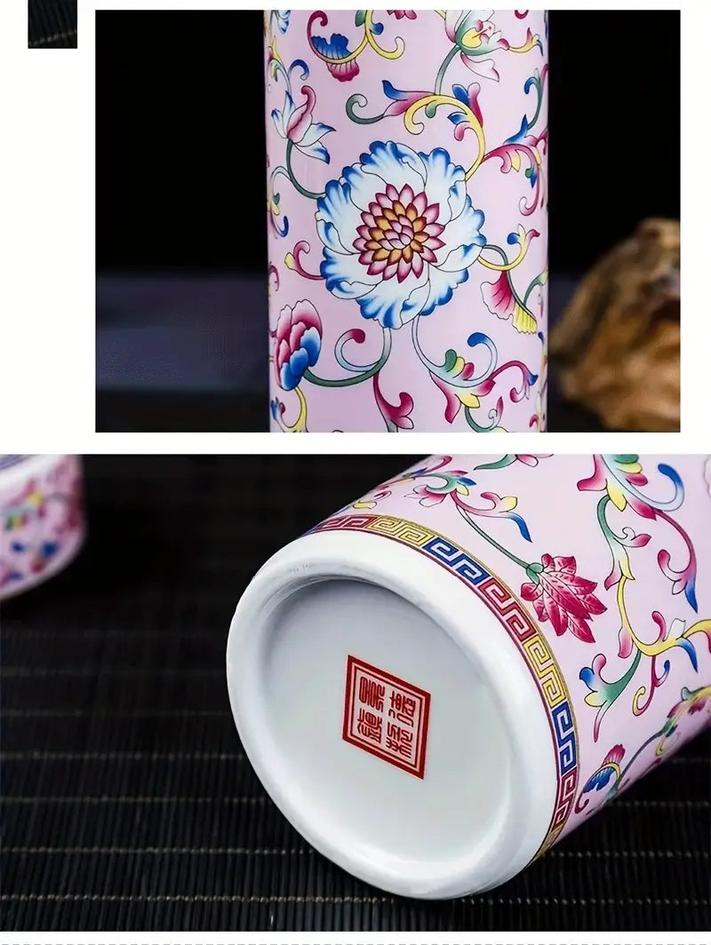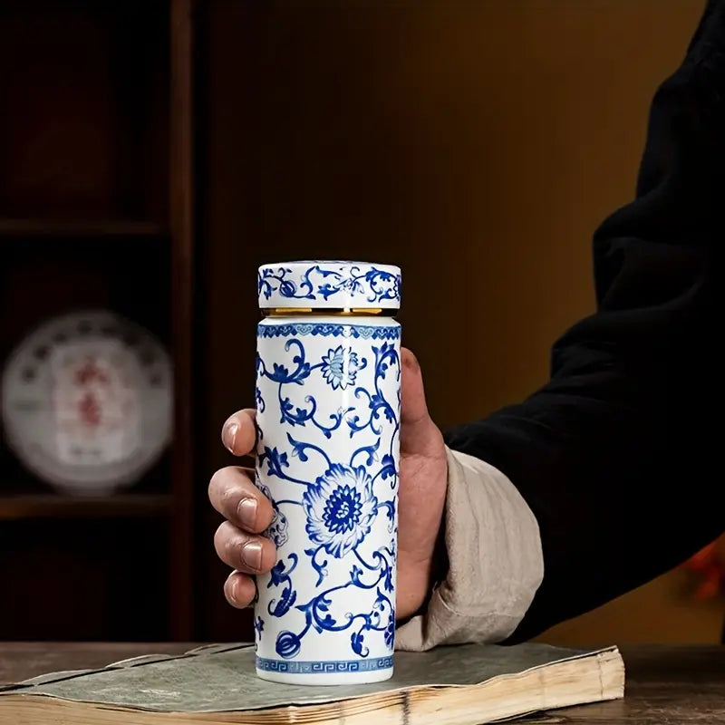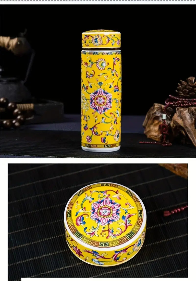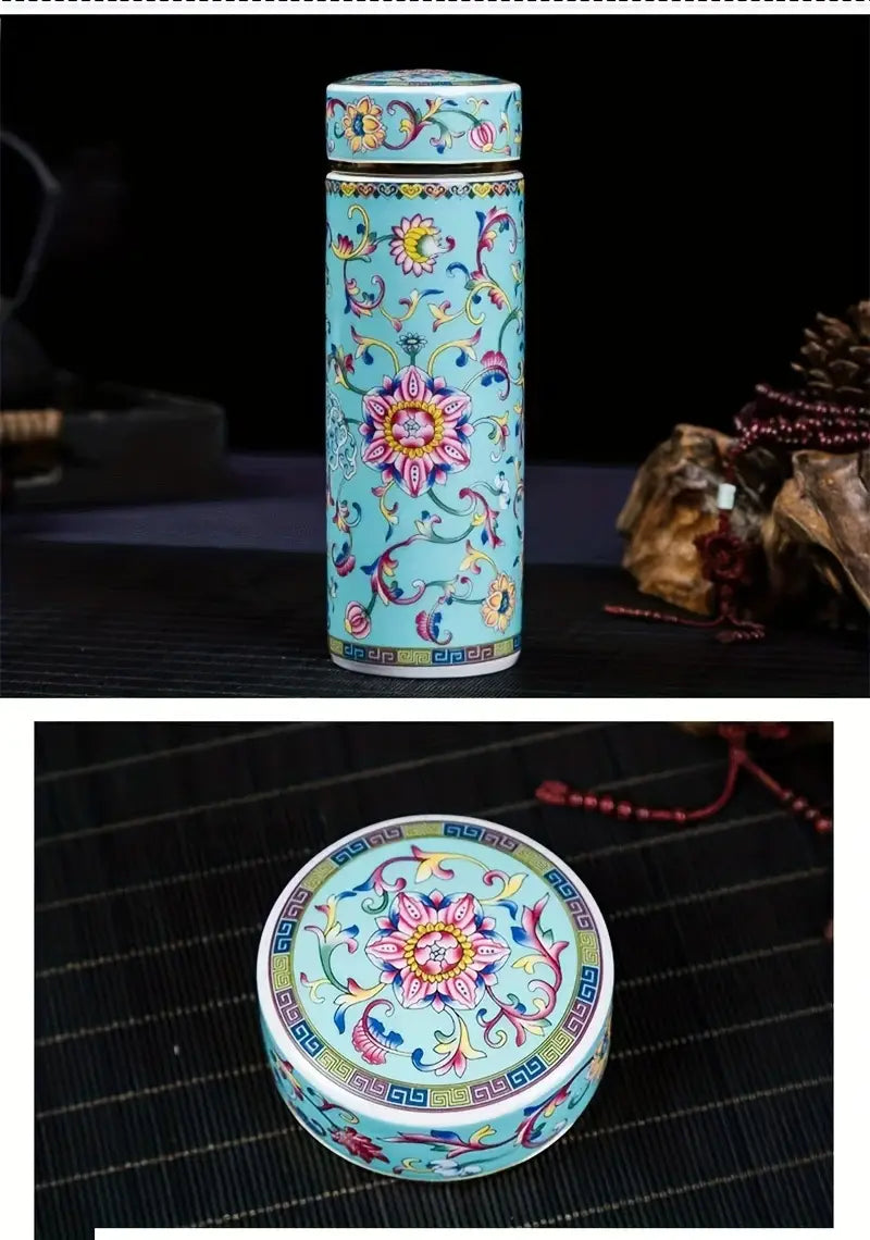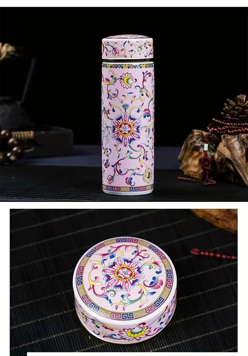 Enjoy your drinks anywhere with this Floral Ceramic Double Insulated Travel Flask. Its double-walled design keeps coffee and tea at the right temperature. The round shape with a delicate flower pattern suits home, office, gym, or outdoor use. Comes with a lid and is best hand washed.