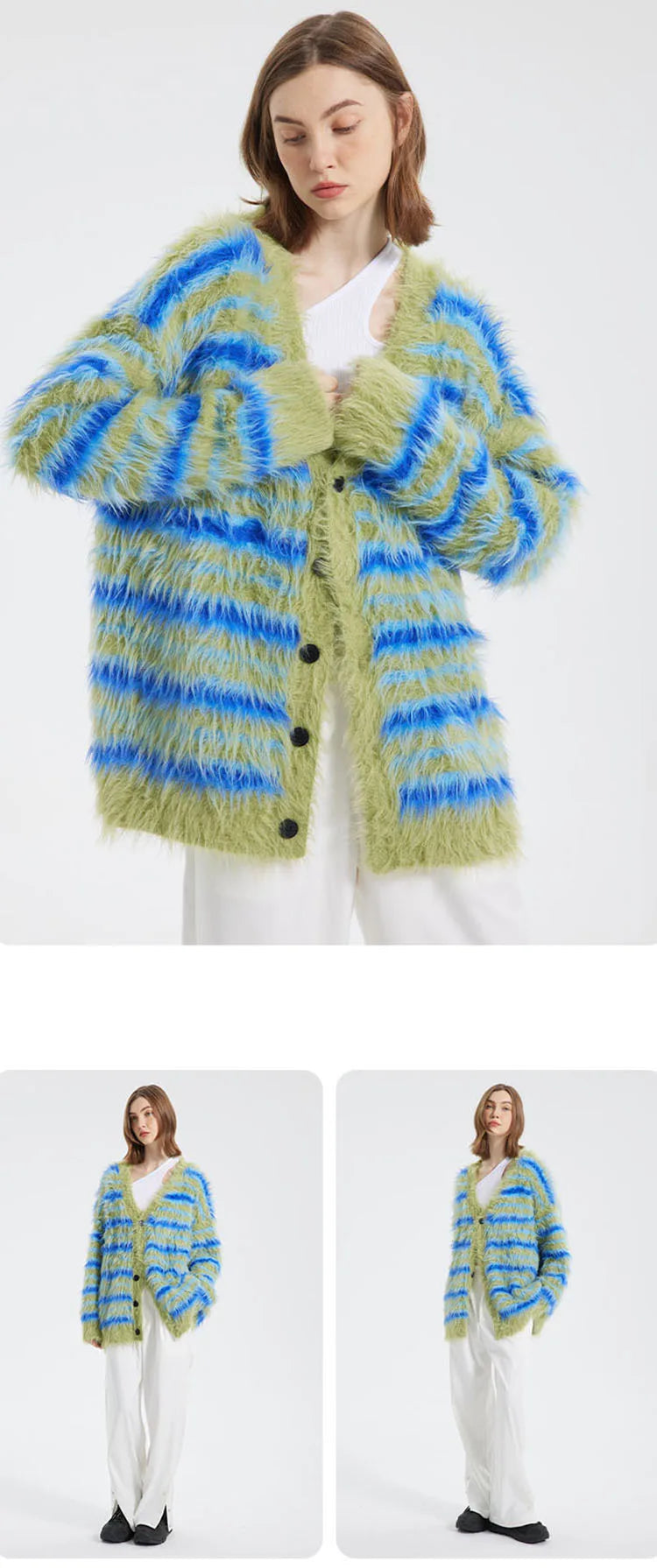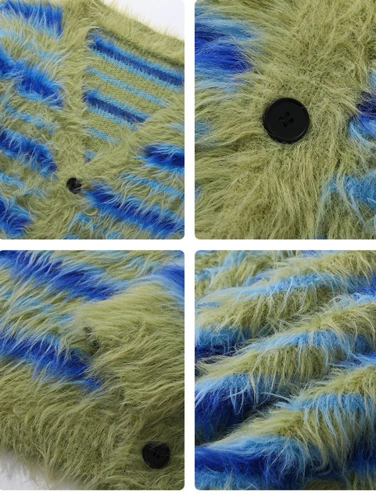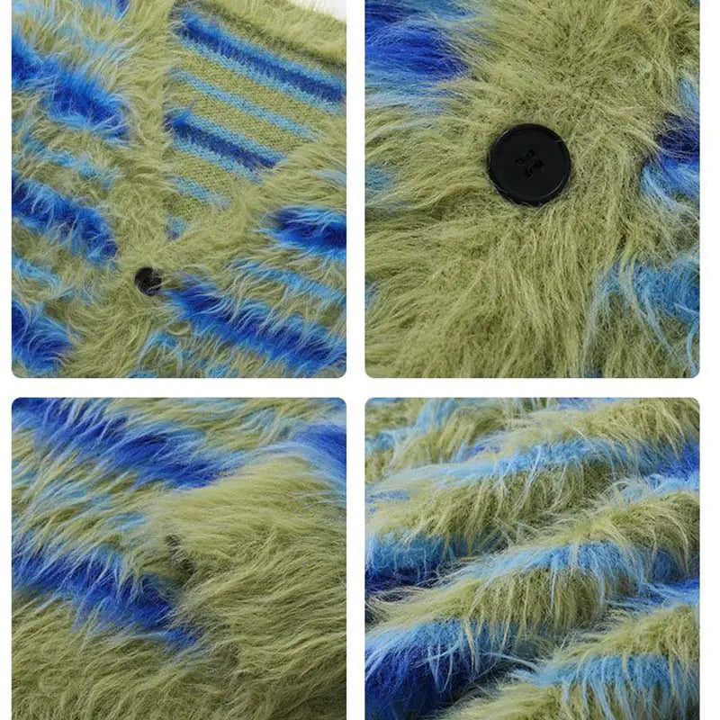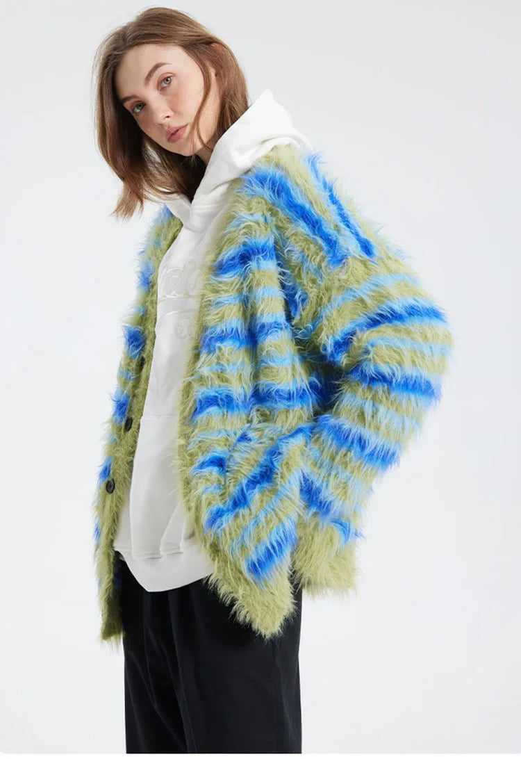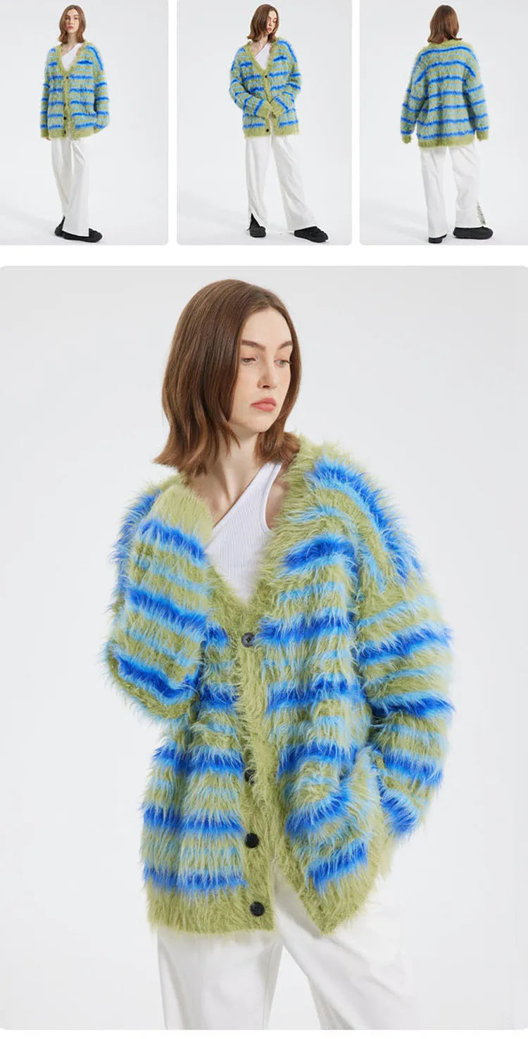 Upgrade Your Wardrobe: Fuzzy Striped Knit Cardigan Upgrade your wardrobe. Whether layered with a jacket or worn solo, its plush fabric and classic stripes add a touch of sophistication to any look.