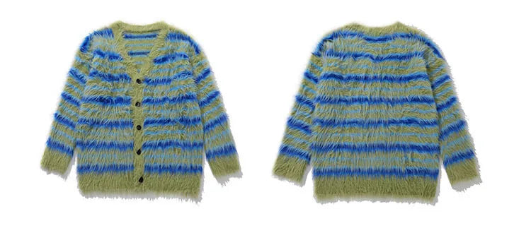 Warmth Meets Fashion Stay warm without sacrificing style in our Fuzzy Striped Knit Cardigan. Ideal for colder days, it pairs beautifully with boots or sneakers for a fashionable ensemble.