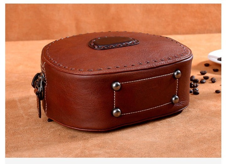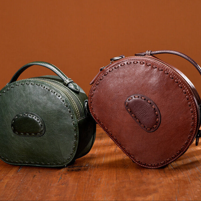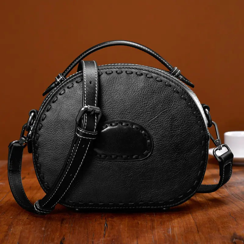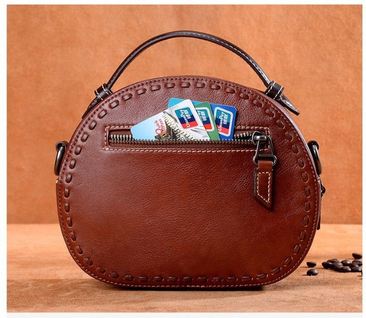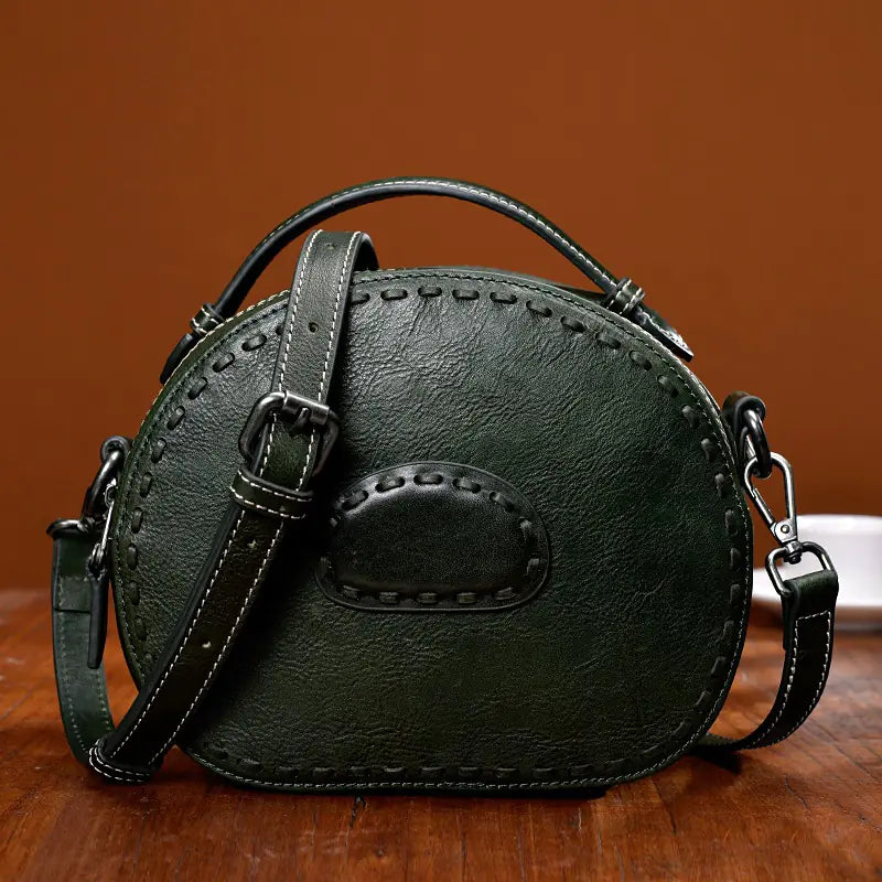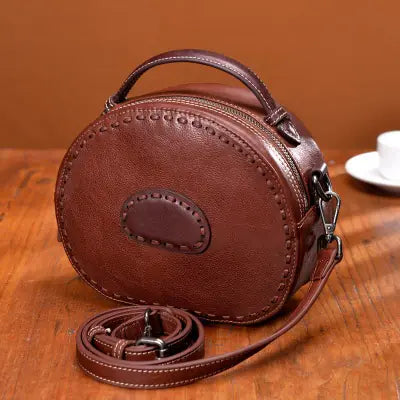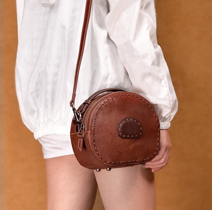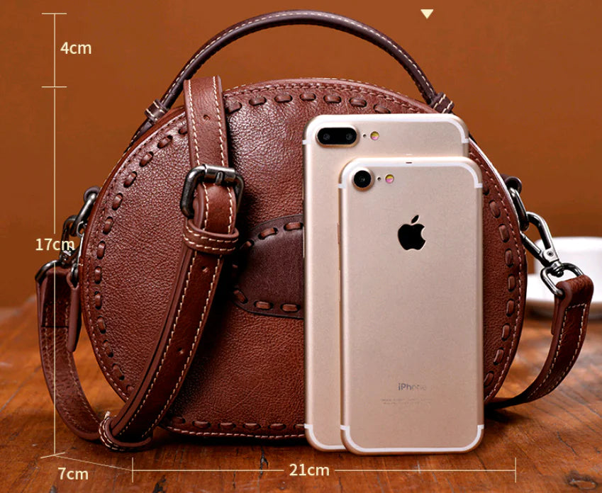 Made from premium head layer cowhide, this bag not only boasts a stunning design but also promises durability and longevity. Its circular shape adds a unique touch, while the medium size offers ample space for your daily essentials without compromising on style.