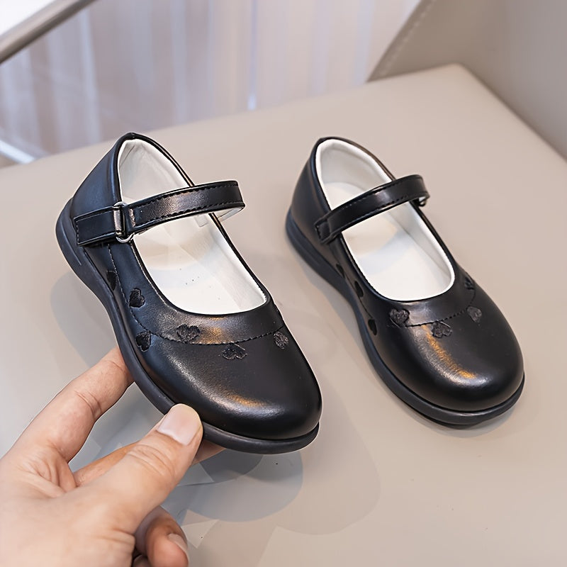 Crafted from black vegan leather, these girls' shoes showcase a charming heart design, perfect for school and special occasions. The soft soles ensure both comfort and style, making them an excellent choice for dress events and school gatherings.