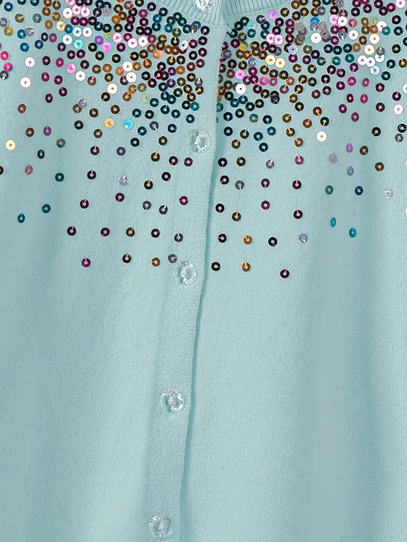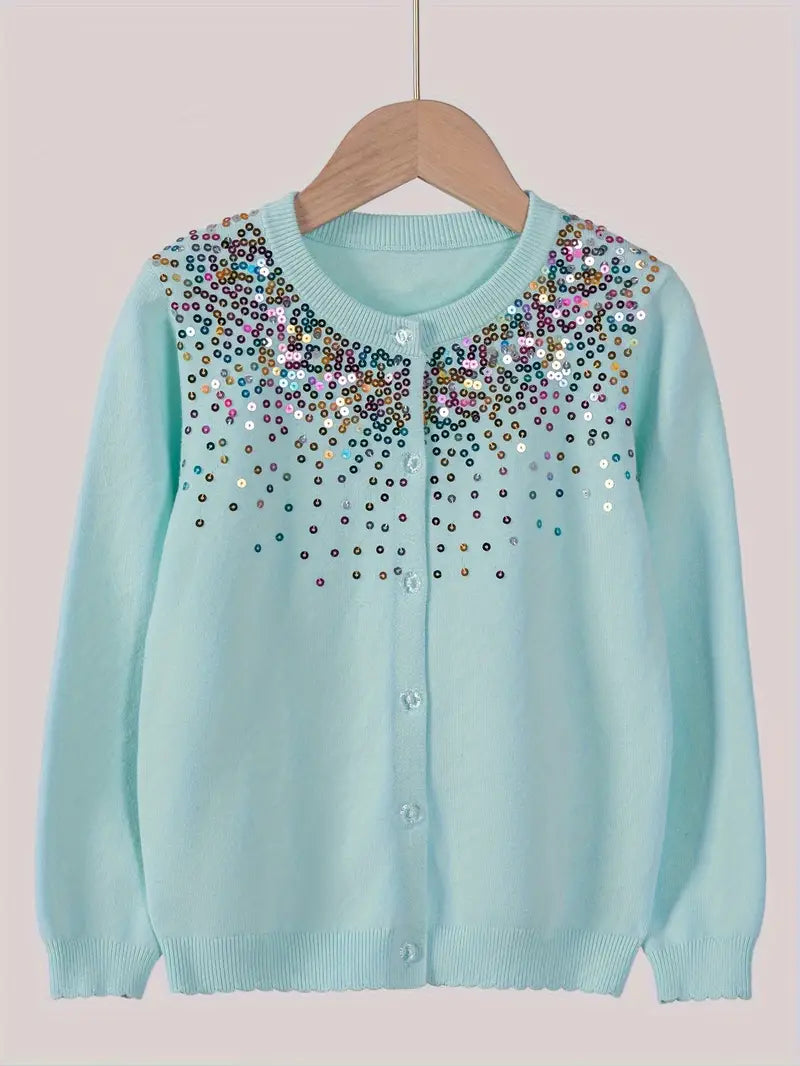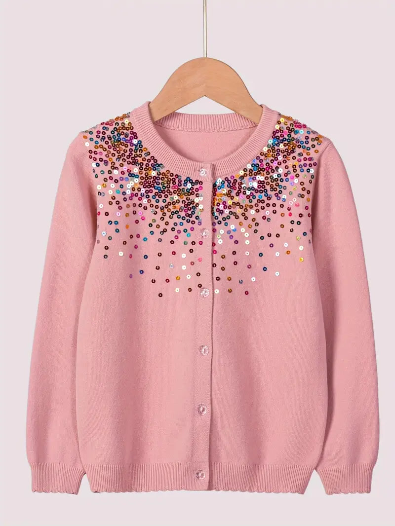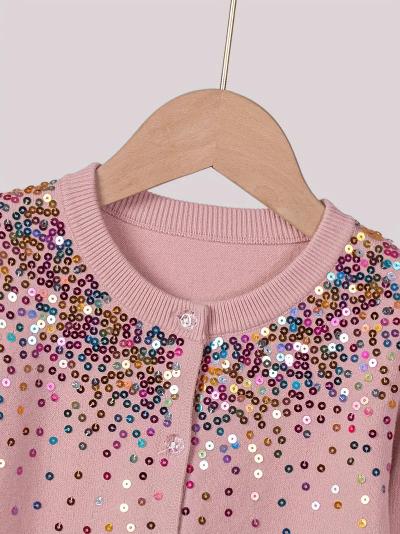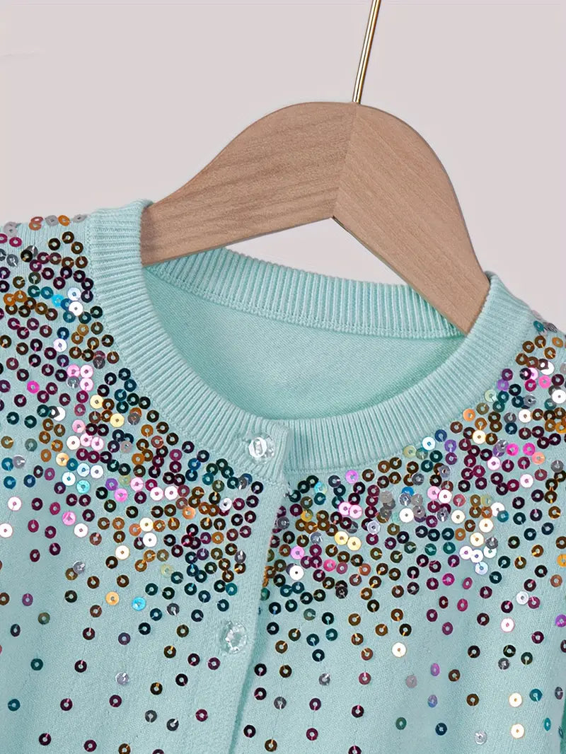 Girls' stylish and vibrant sequined round neck cardigan adds a sparkling touch to any casual outfit. Designed for year-round wear, it offers both comfort and flair, making it an ideal choice for everyday activities or special occasions. The lightweight fabric ensures ease of movement, while the sequined detail brings a fun, eye-catching element that your child will love to wear again and again. Elevate her wardrobe with this versatile and charming cardigan that combines practicality with playful elegance.