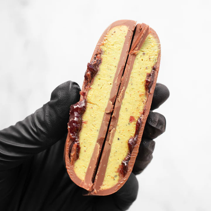 Made with the finest 37% cacao creamy milk chocolate, this heart-shaped delight is filled with layers of indulgence. Nutty house-made pistachio praline, paired with tart cherry jam encased in a delectable milk chocolate shell.