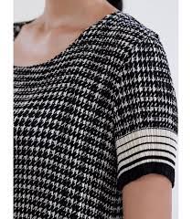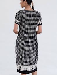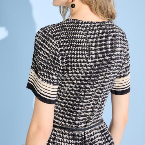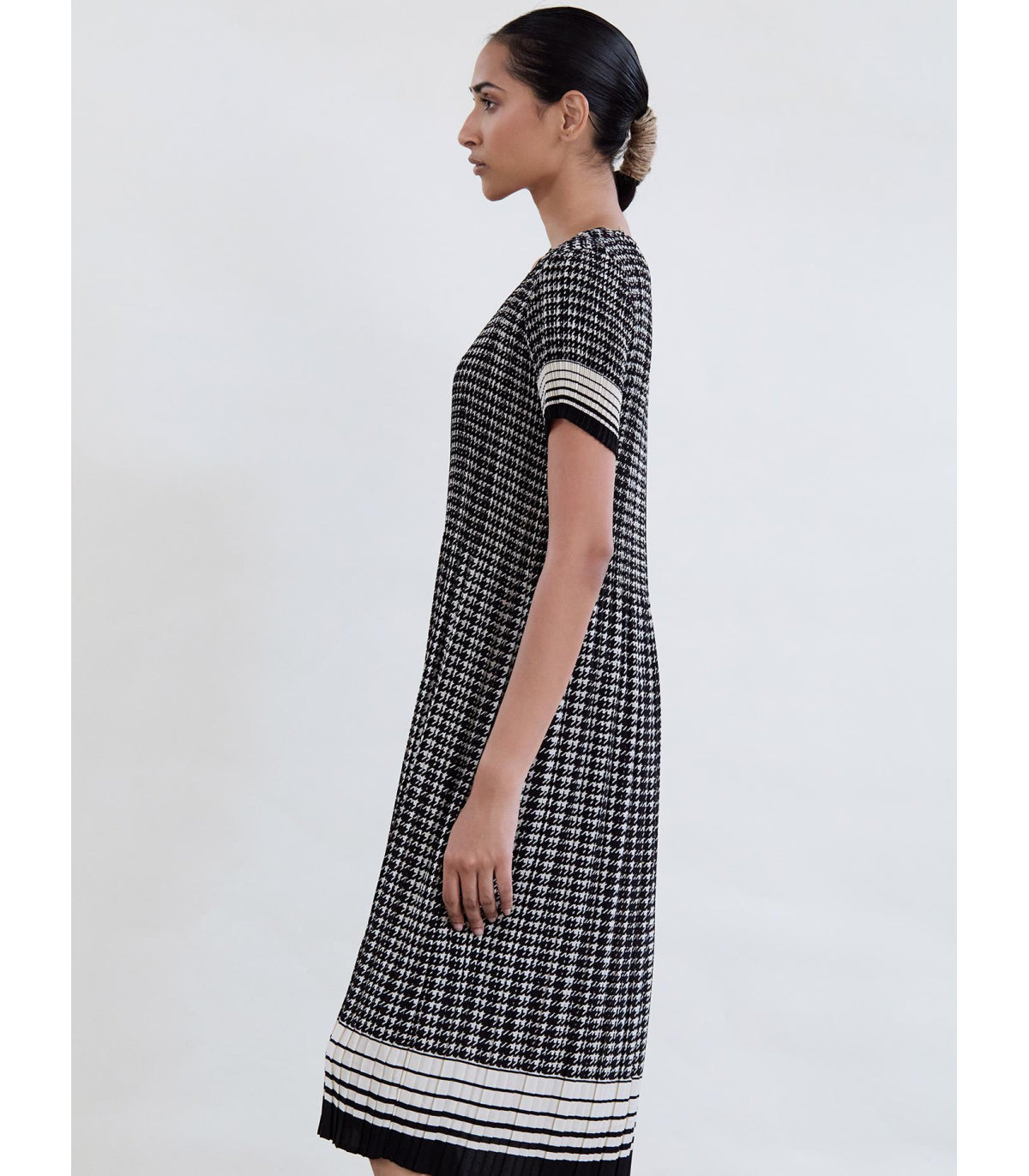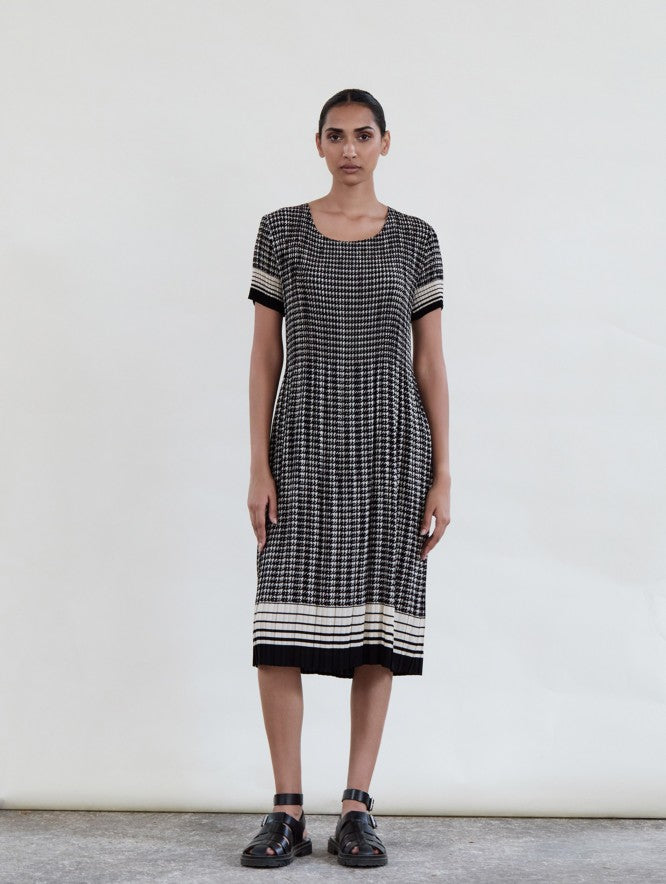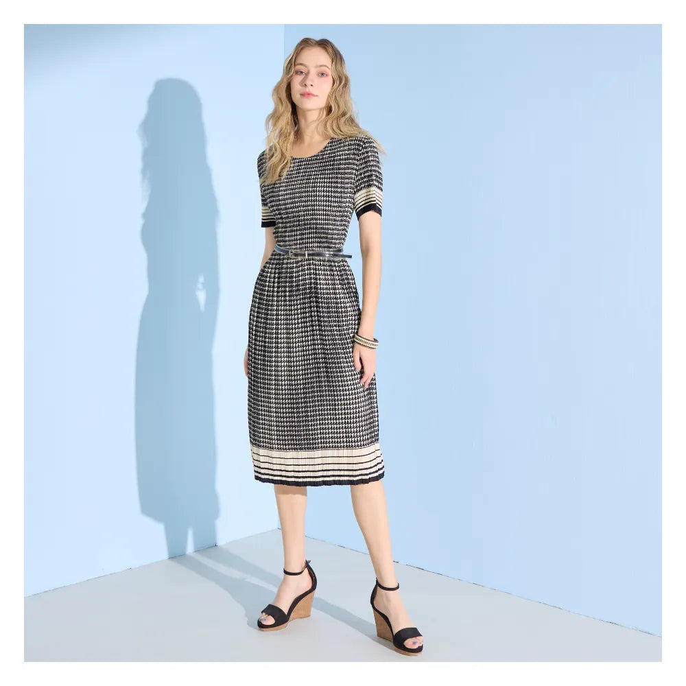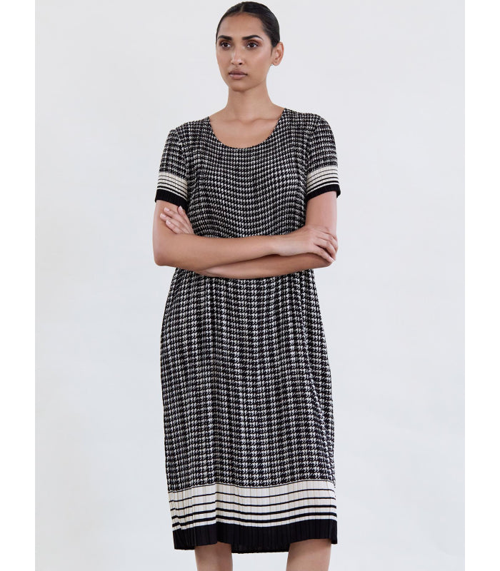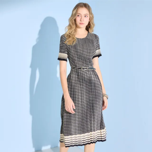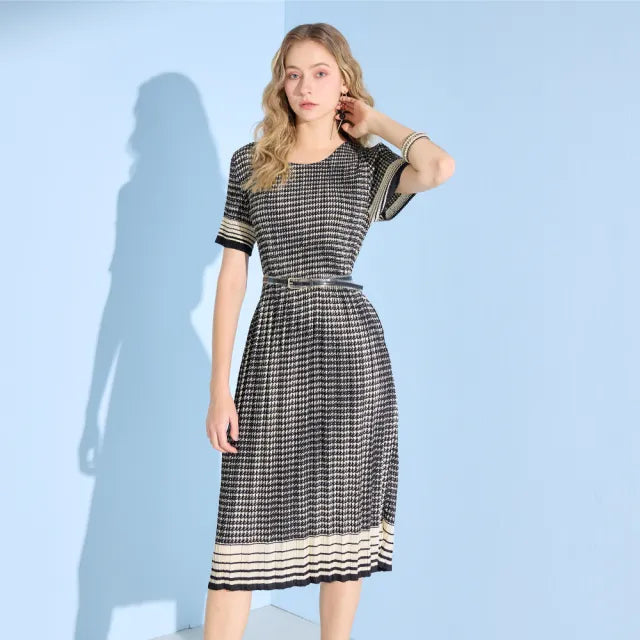 This elegant polyester dress features a pleated design crafted from a "non-iron" technical fabric. It showcases a classic houndstooth pattern, a round neckline, and short sleeves. Designed to fit all sizes comfortably.