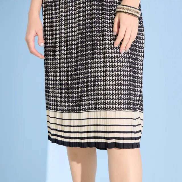 This houndstooth pleated midi dress combines elegance with versatility, suitable for both formal and casual occasions. Made from stretchy, non-see-through polyester fabric, it ensures comfort and breathability for everyday wear. Designed for easy care, it offers a chic and practical option for fashion enthusiasts seeking stylish yet functional attire.