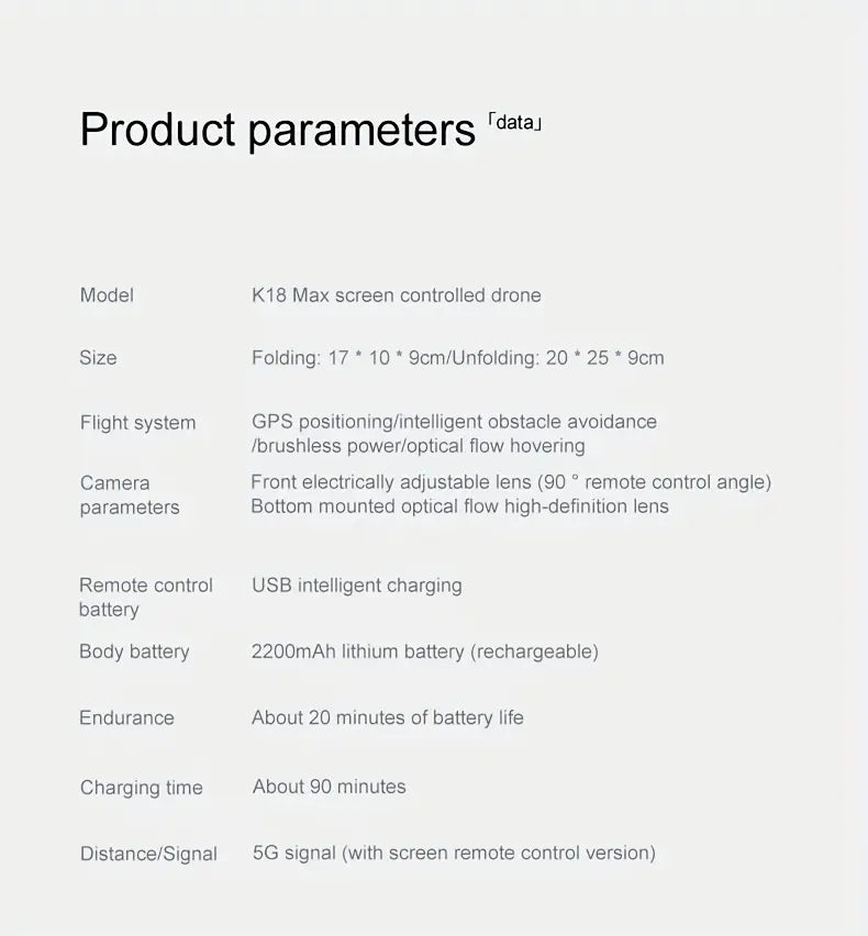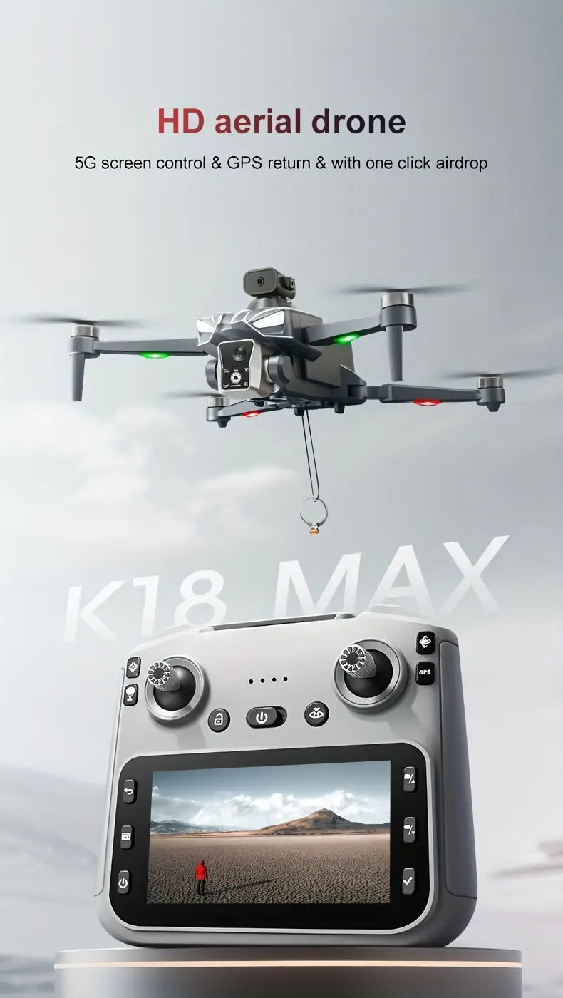 The K18MAX drone is equipped with a 4.5-inch display and integrated GPS for precise navigation. Powered by a brushless motor, it offers extended flight time and advanced 360° obstacle avoidance. Features include one-key return (RTH), 50x zoom capability, and 5G HD FPV live streaming. Its intelligent follow mode supports professional applications such as vlogging, photography, and architectural surveying. Delivering high-quality, stable aerial imagery, this drone is an excellent choice for serious users requiring reliable and versatile performance.