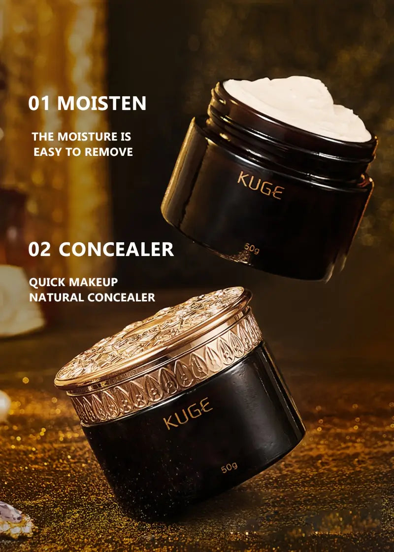 Kugé Air Cushion Concealer Cream offers a silky, non-sticky texture infused with ginseng, reishi, and witch hazel extracts to hydrate and nourish your skin. Designed for all light beige tones, it delivers medium coverage with a natural finish. This formaldehyde-free formula comes in elegant black and gold packaging, combining luxury skincare benefits with a sleek, convenient jar design.