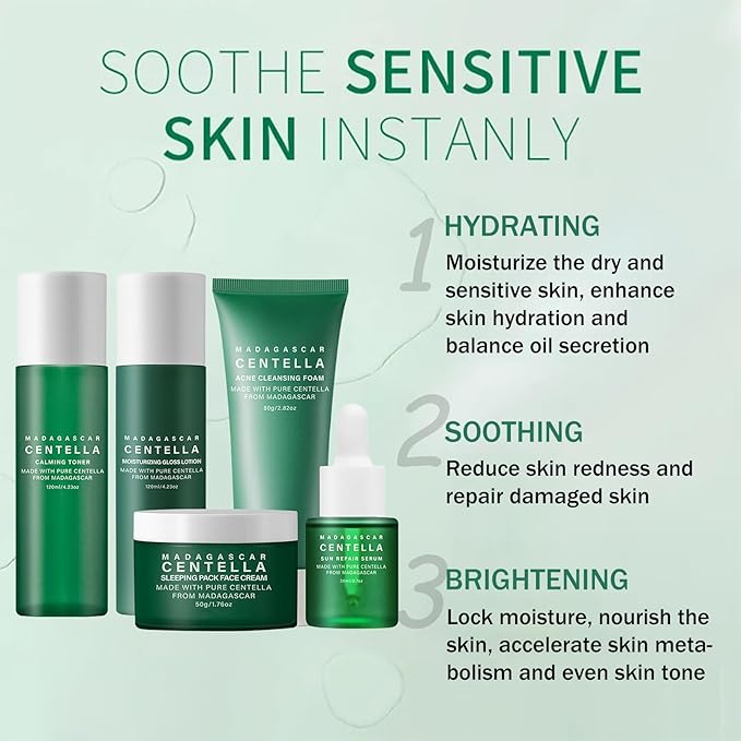 Pamper your skin with the Madagascar Centella Asiatica Extract Skincare Set and embrace the beauty of radiant, glowing skin!
