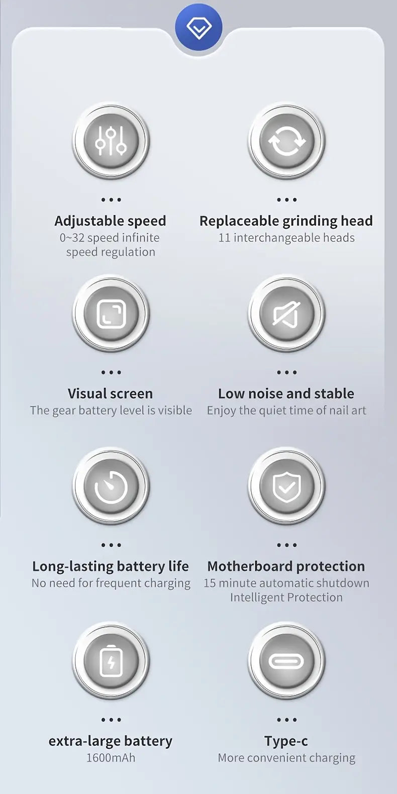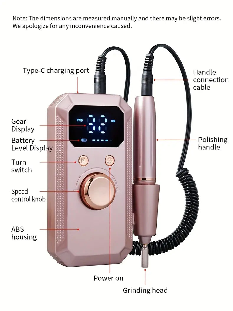 This professional electric nail care device combines precision engineering with practical versatility. The 32-speed settings allow fine-tuned control across varying nail densities and textures, essential for achieving consistent results on both fingernails and toenails. USB charging technology ensures reliable power delivery and portability, while the included file and cuticle pusher attachments provide a complete grooming solution. Designed for both personal use and professional salon applications, this tool delivers the technical performance and durability expected in professional-grade nail care equipment.