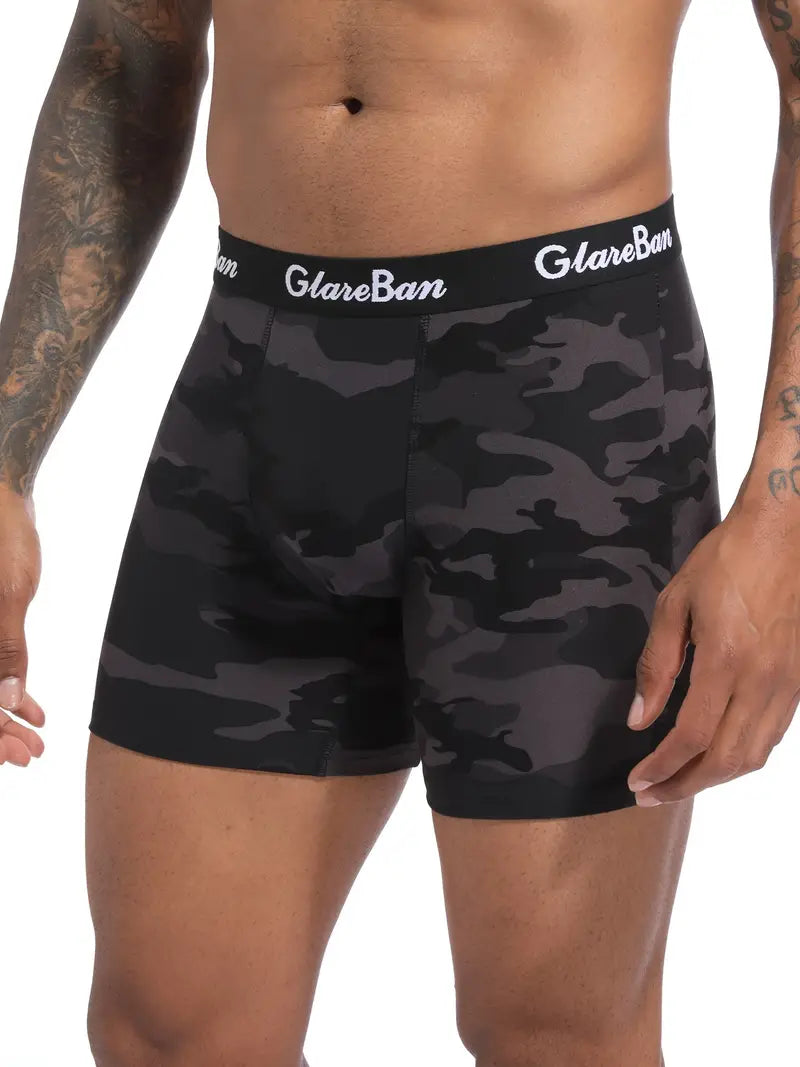 GlareBan Boxer Briefs in Black Camouflage Pattern made with high-quality polyester and spandex, these boxers offer superior comfort and breathability.