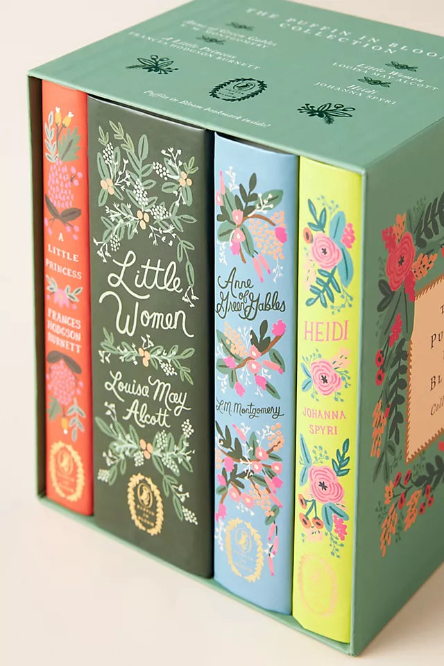 The Puffin in Bloom line of children's classics with cover illustrations by Anna Bond, now available as an exquisite gift set just in time for the holidays! The hard, collectible box includes four paper-over-board classic titles, Anne of Green Gables, Little Women, Heidi, and A Little Princess, plus an exclusive item from Rifle Paper Co.
