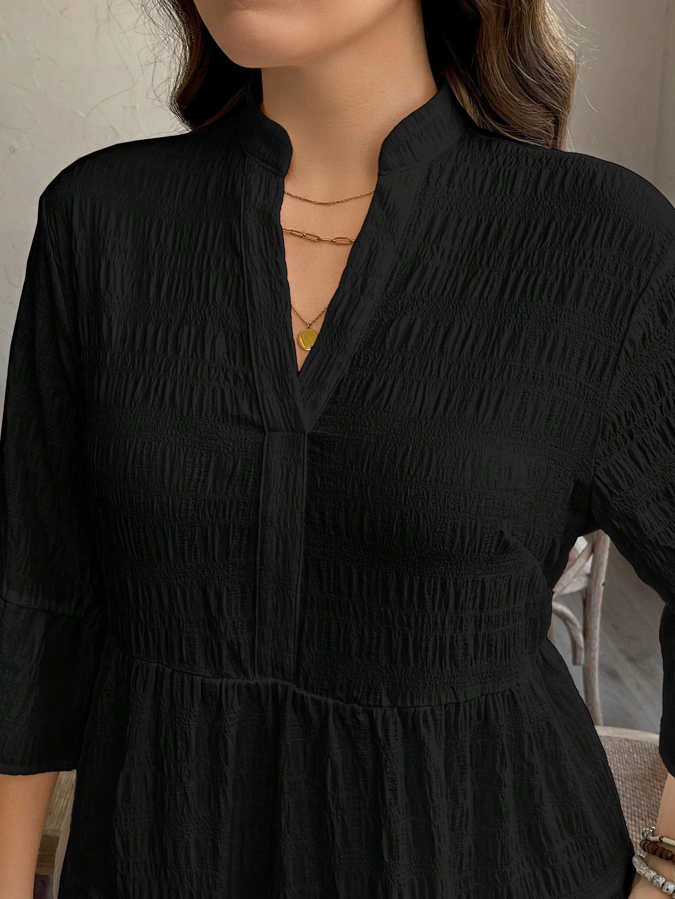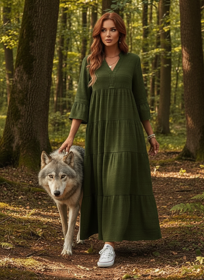 Emery Rose Ruffle Hem Polyester Maxi Dress features a V-neck design and a flattering A-line silhouette with a loose, flared fit. Crafted from flowy polyester fabric, it offers comfort and style for both casual and formal occasions. Suitable for spring and fall, this long dress is easy to care for with machine washable convenience.