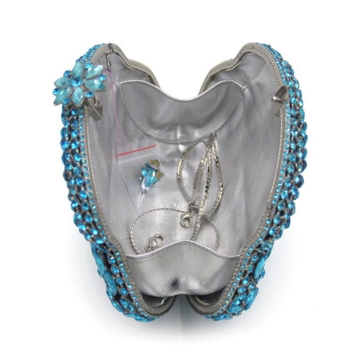 Elegant Rhinestone Evening Clutch Bags with three-dimensional structure and silky polyester lining. Features secure file compartment, sparkling surface, alloy details, and a crossbody chain.