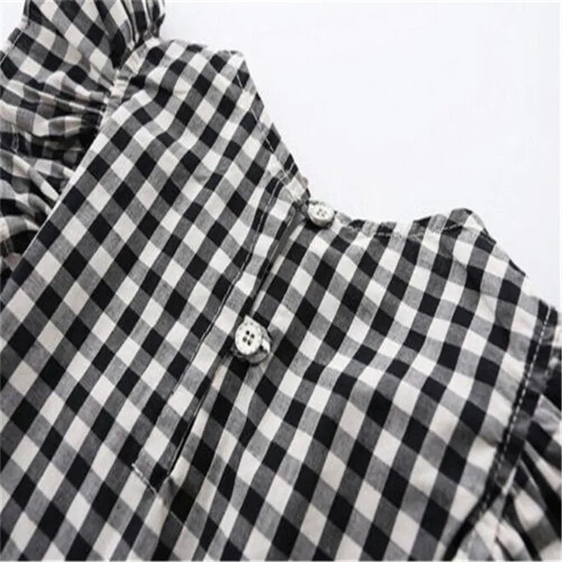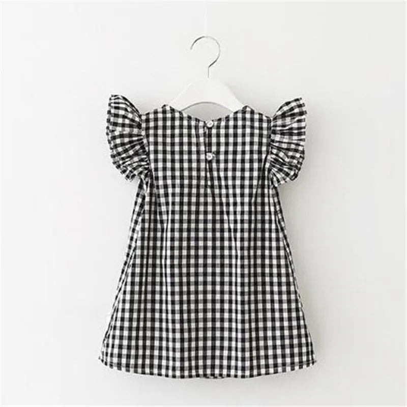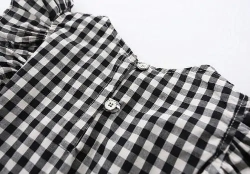 Step into Timeless Elegance with Our Ruffle Gingham Dress - Elevate your little girl's wardrobe with our exquisite Ruffle Gingham Dress, crafted to blend classic charm with modern sophistication. This dress features a delicate ruffle detail that cascades gracefully down the front, accentuating your silhouette with a touch of feminine allure. Perfect for both casual outings and special occasions, its timeless black & white gingham pattern adds a chic flair that effortlessly transitions from day to evening. Embrace versatile style and undeniable elegance with every step you take in this must-have piece.