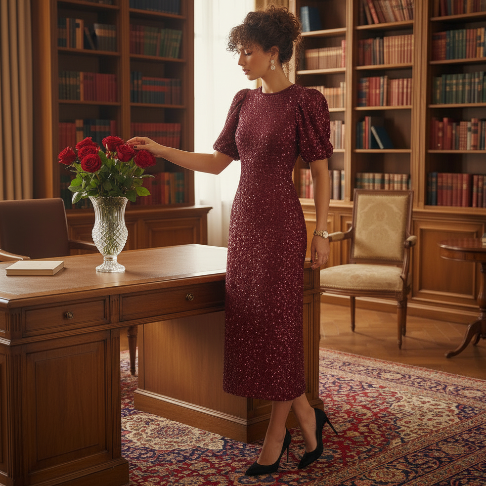 Puff Sleeve Sequin Midi Dress