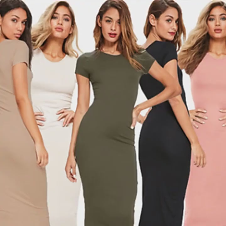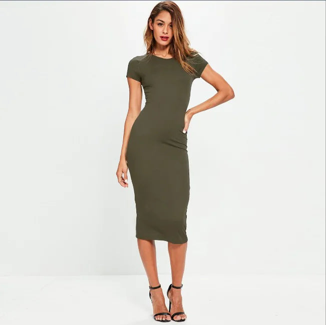 Short Sleeve Crew Neck Midi Bodycon Slip Dress