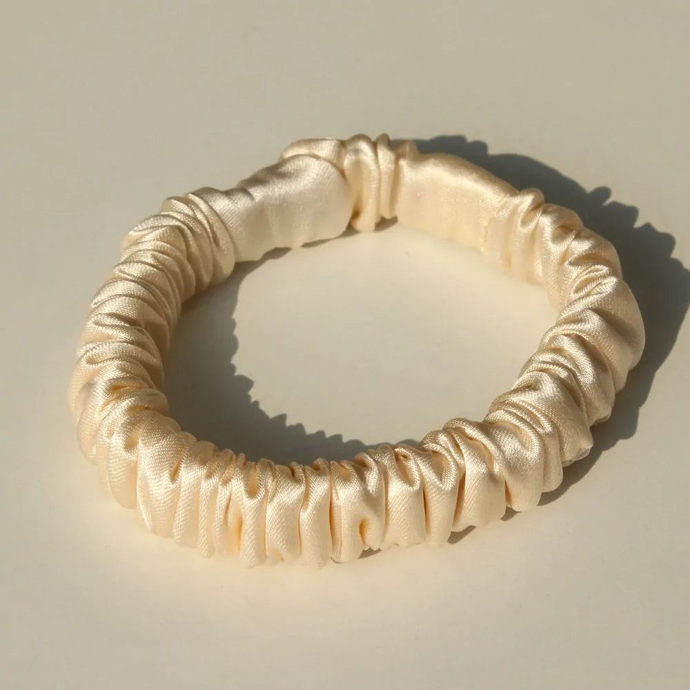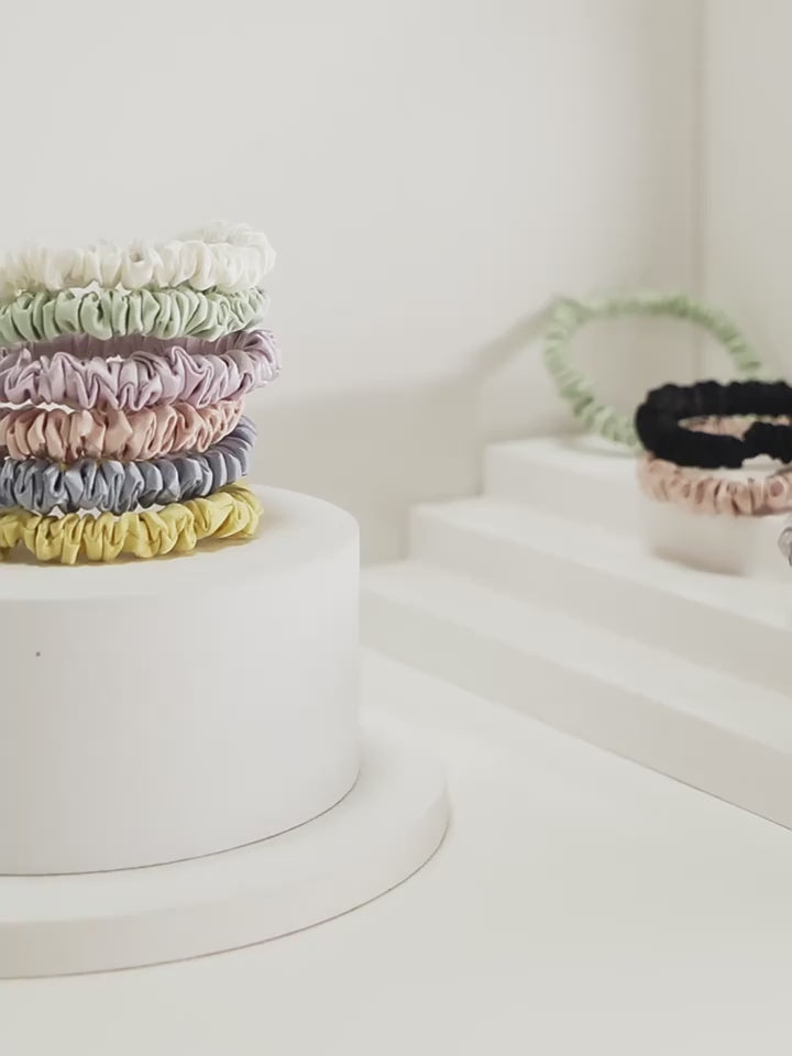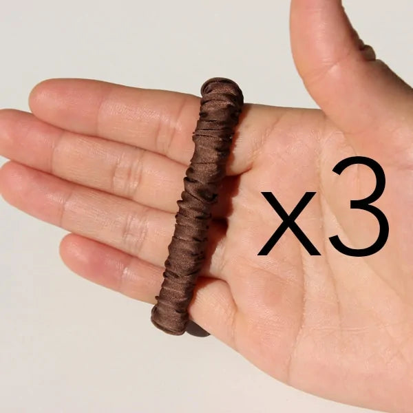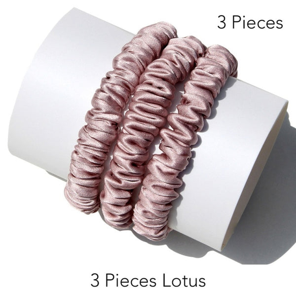 The best part about our mini silk hair scrunchies is that they look just as good on your wrist as they do in your hair! These small silk hair bobbles will become your new everyday essential. These skinny scrunchies are available in an extensive range of colors to suit all hair types.