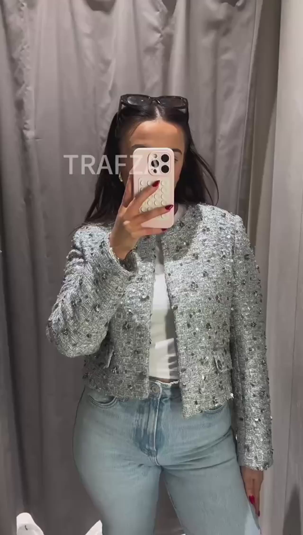 Short jacket with a round collar and long sleeves. Featuring false flap pockets on the front, textured fabric with sequin appliqués, lining, a straight hem and front fastening.