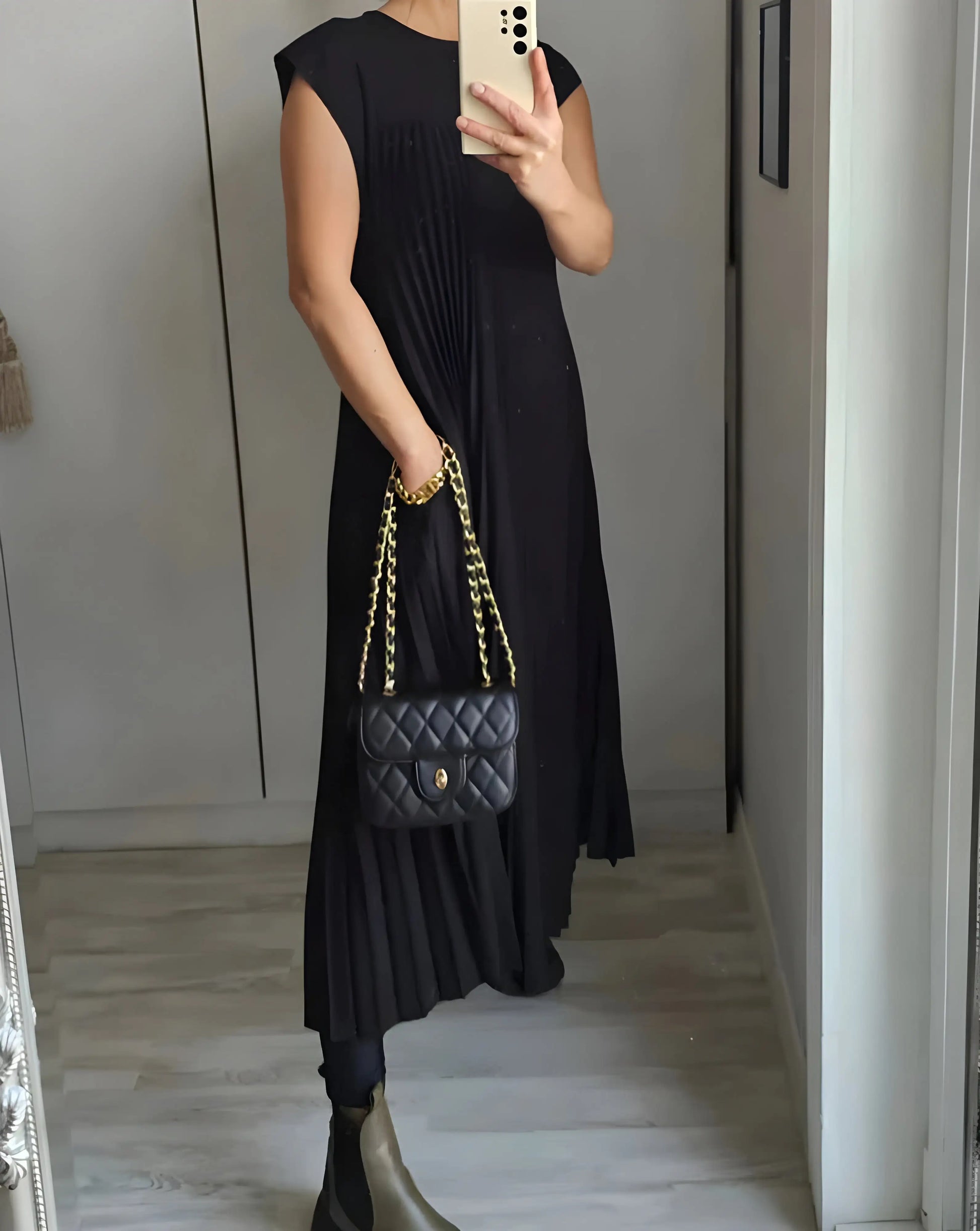 Step into Elegance with a Sleeveless Pleated Dress Elevate your style with the timeless sophistication of a sleeveless pleated dress. It's very flattering silhouette and delicate pleats make it a wardrobe essential for any occasion, ensuring you look effortlessly chic and polished.