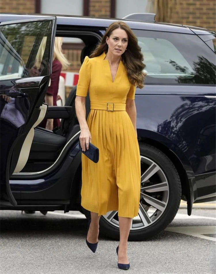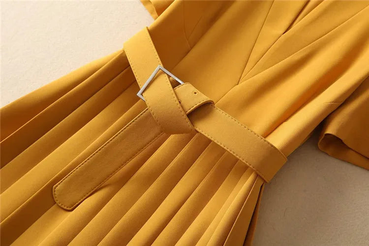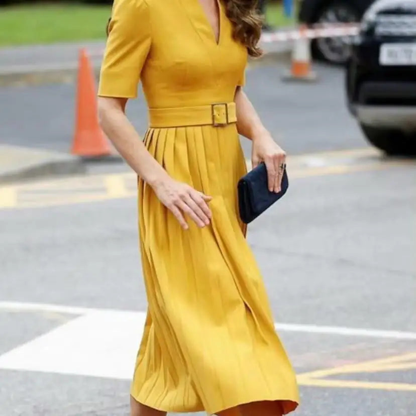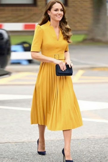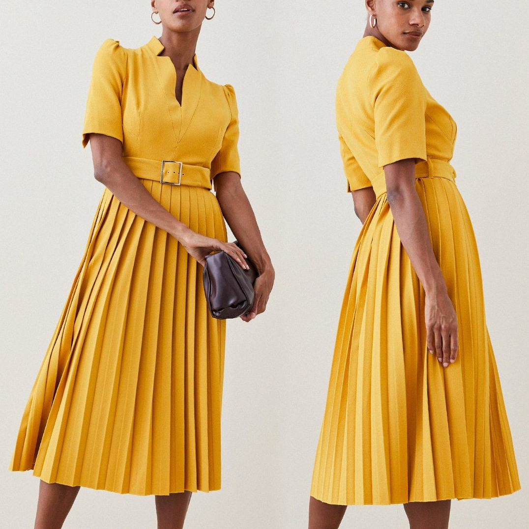 The 'Forever' dress by Karen Millen is made from a structured crepe in a bright old gold. Designed to outlast trends and seasons, it shows off a notched neckline, elbow-length sleeves and pressed pleats. It buckles neatly at the waist with a matching fabric belt.
