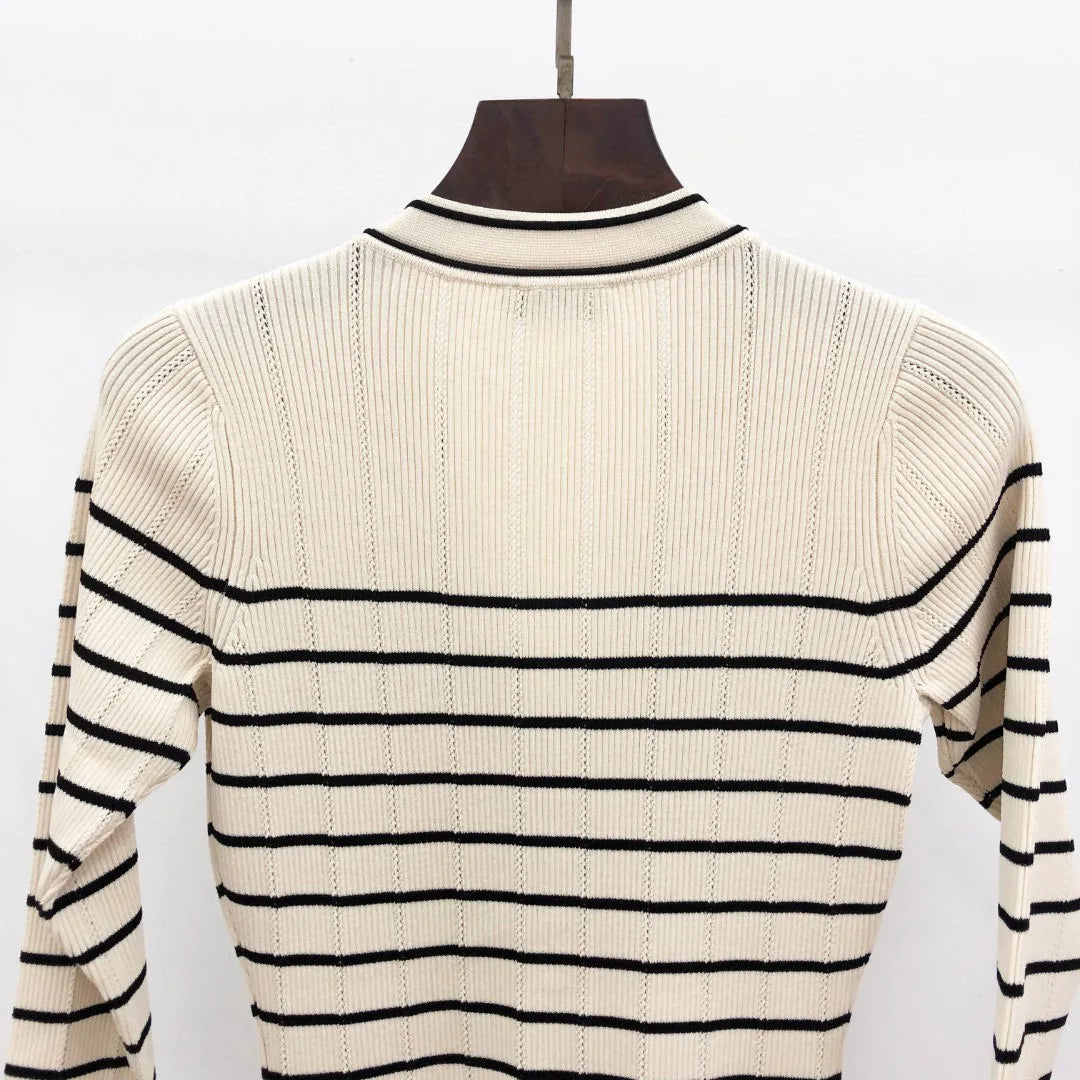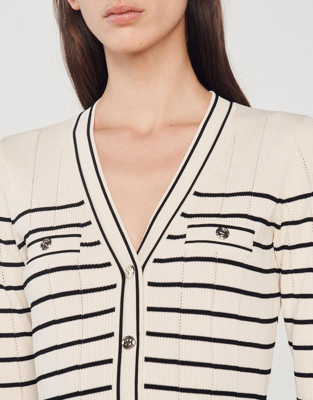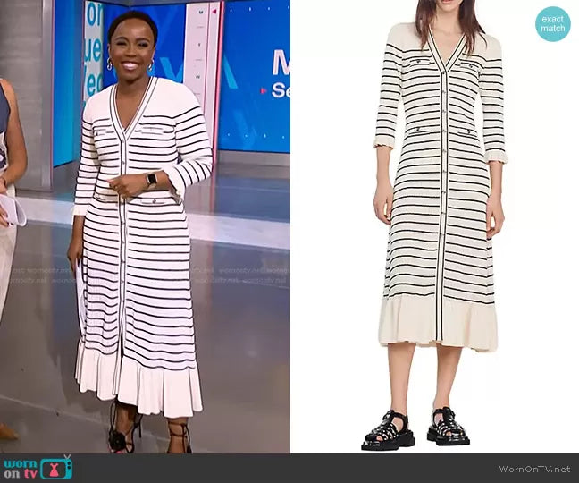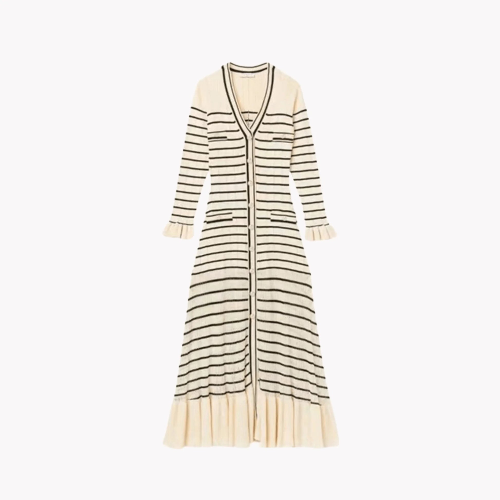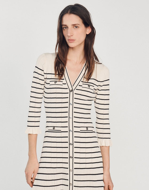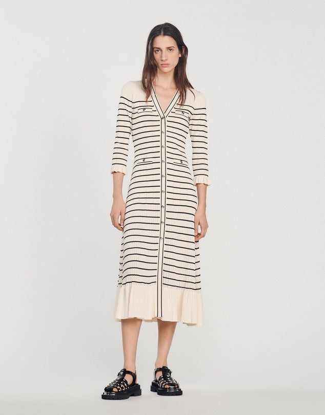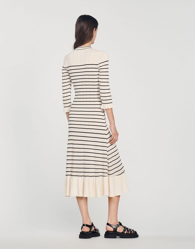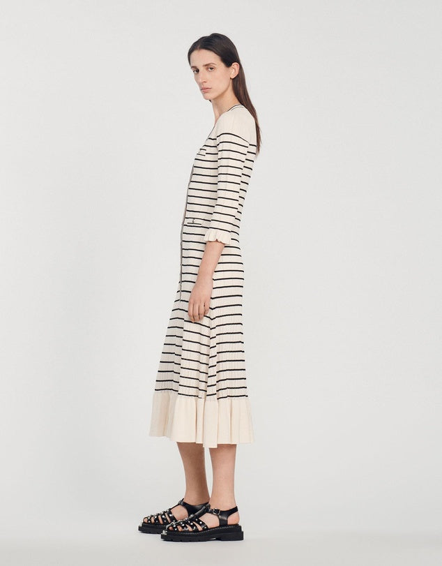 Embrace Comfort and Style in Every Stripe of Our Midi Dress Experience the perfect combination of cozy and fashionable with this Armelline Sandro Striped Knit Midi Dress.