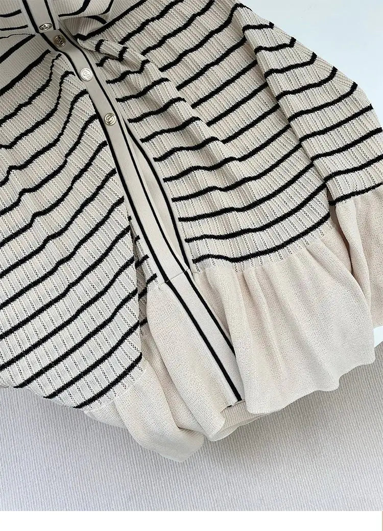 Relaxed fit, V-neck, long sleeves, four non-functional button welt pockets at front, all-over stripe print, ruffled cuffs and hem