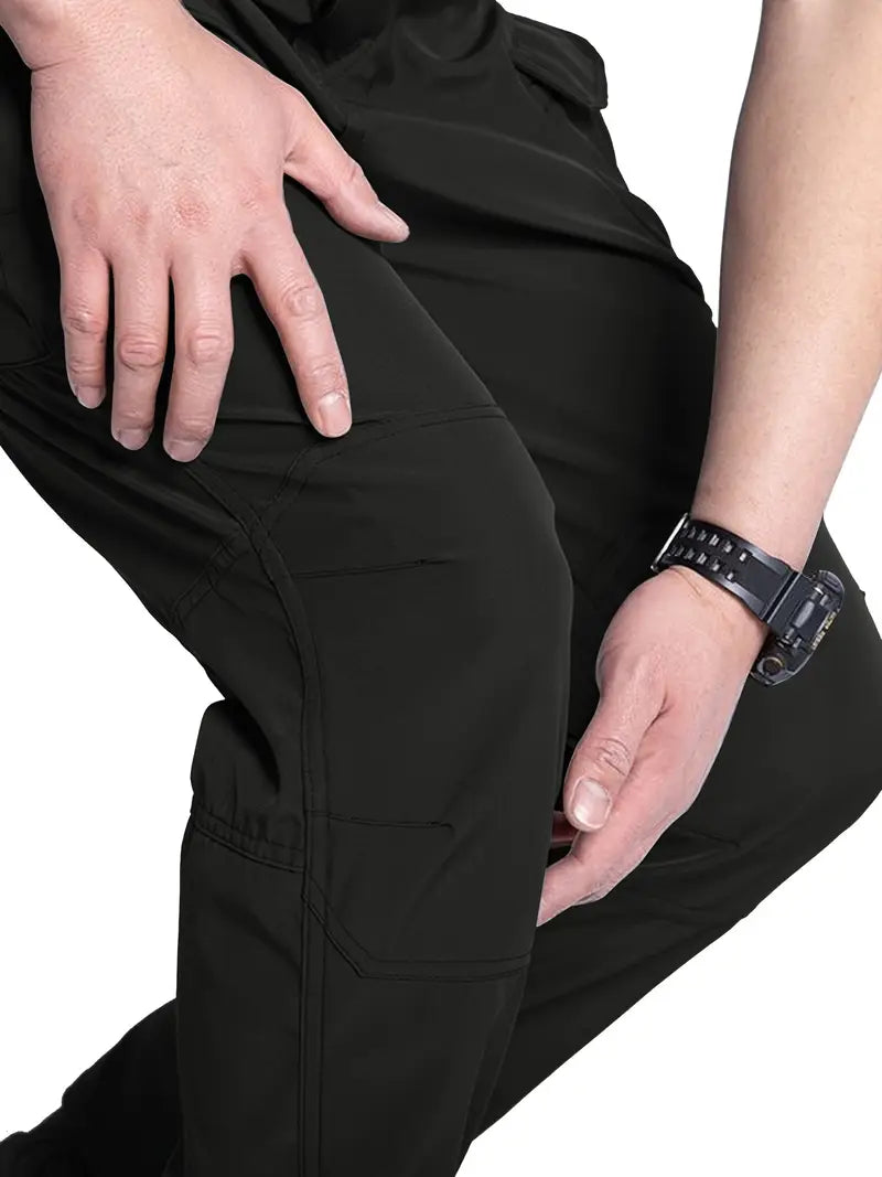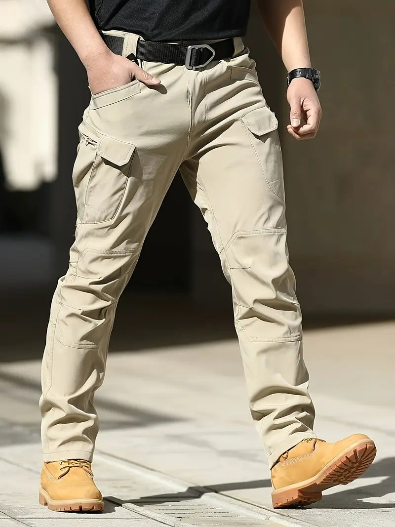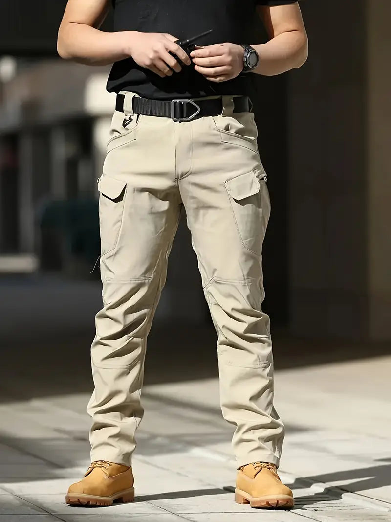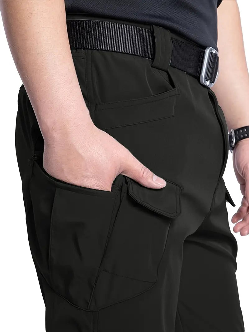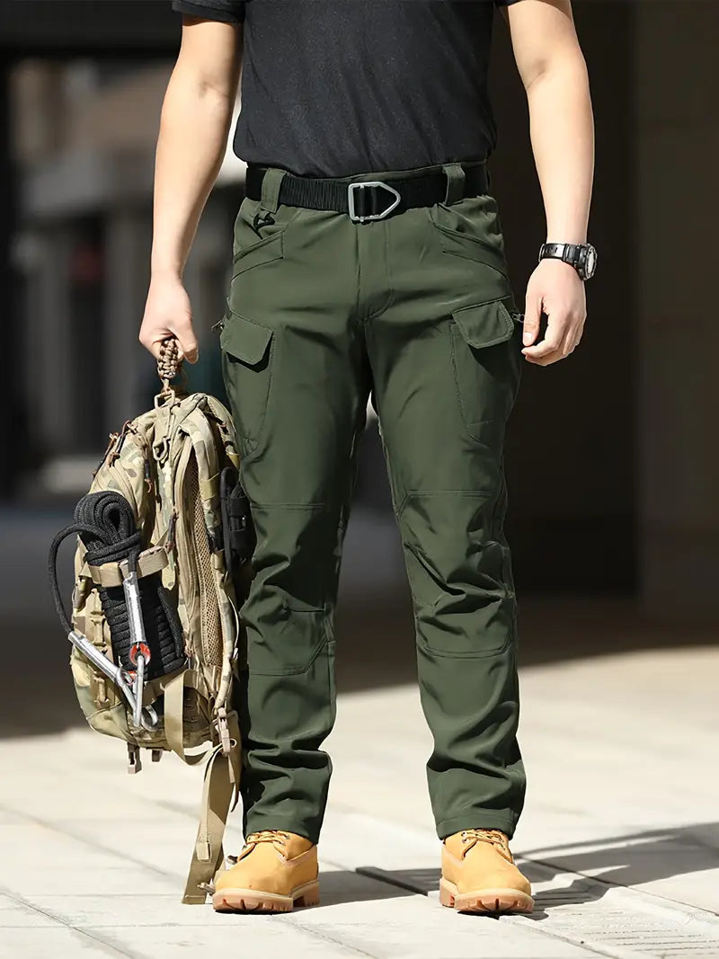 These men's tactical cargo pants feature multiple utility pockets, including leg straps and side compartments, crafted from soft stretch fabric for enhanced comfort and mobility. Designed without a belt for ease of movement, they are ideal for outdoor activities such as hiking, camping, and various work environments. Offering versatile all-in-one functionality with a solid color finish, these flexible trousers are engineered to meet the demands of tactical workwear and camping gear.