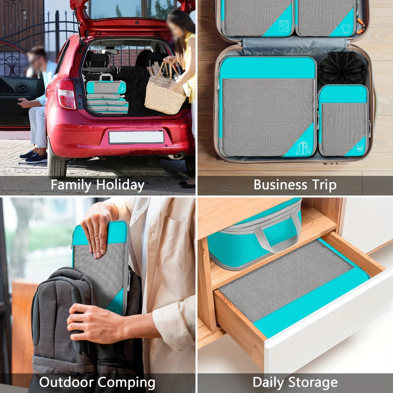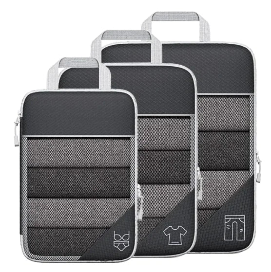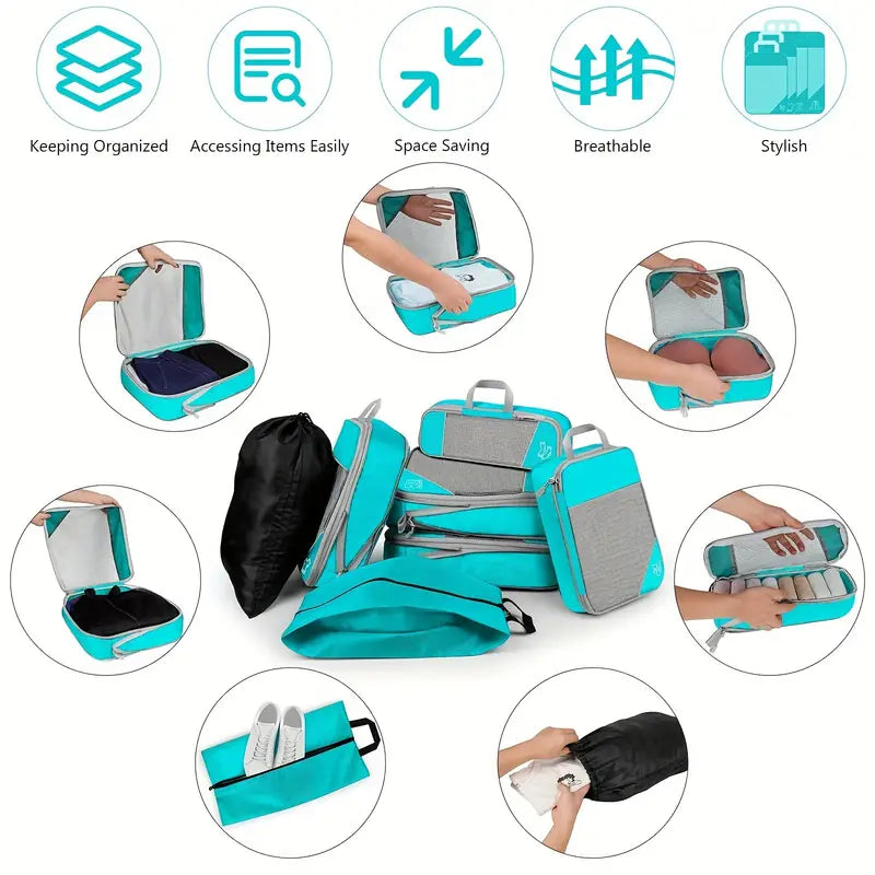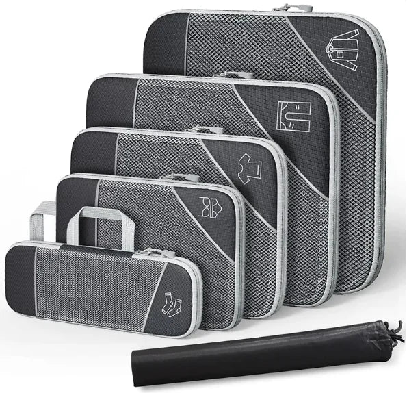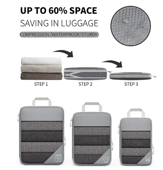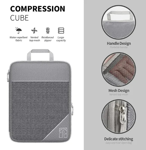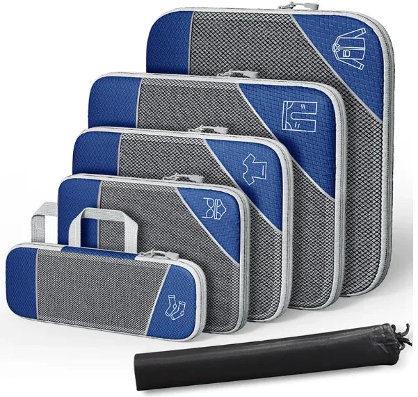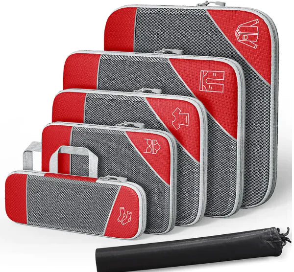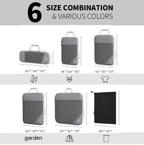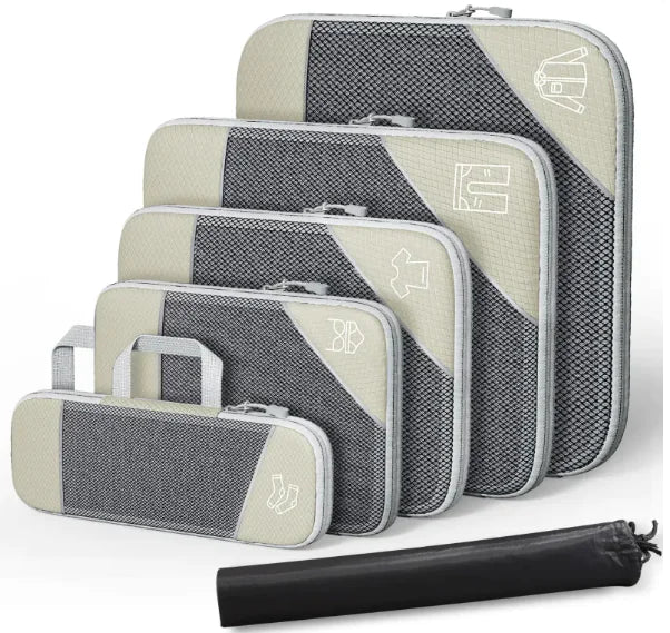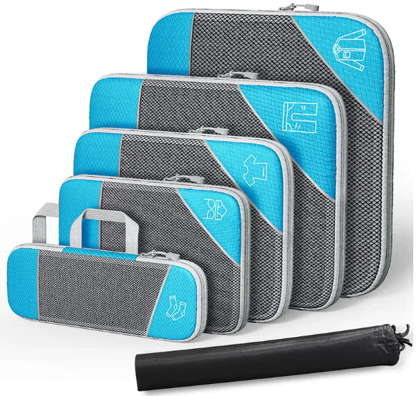 Travel Compression Packing Cubes are designed to keep your luggage organized and maximize space. This set includes compression bags and a shoe bag with a mesh visual design for easy identification.